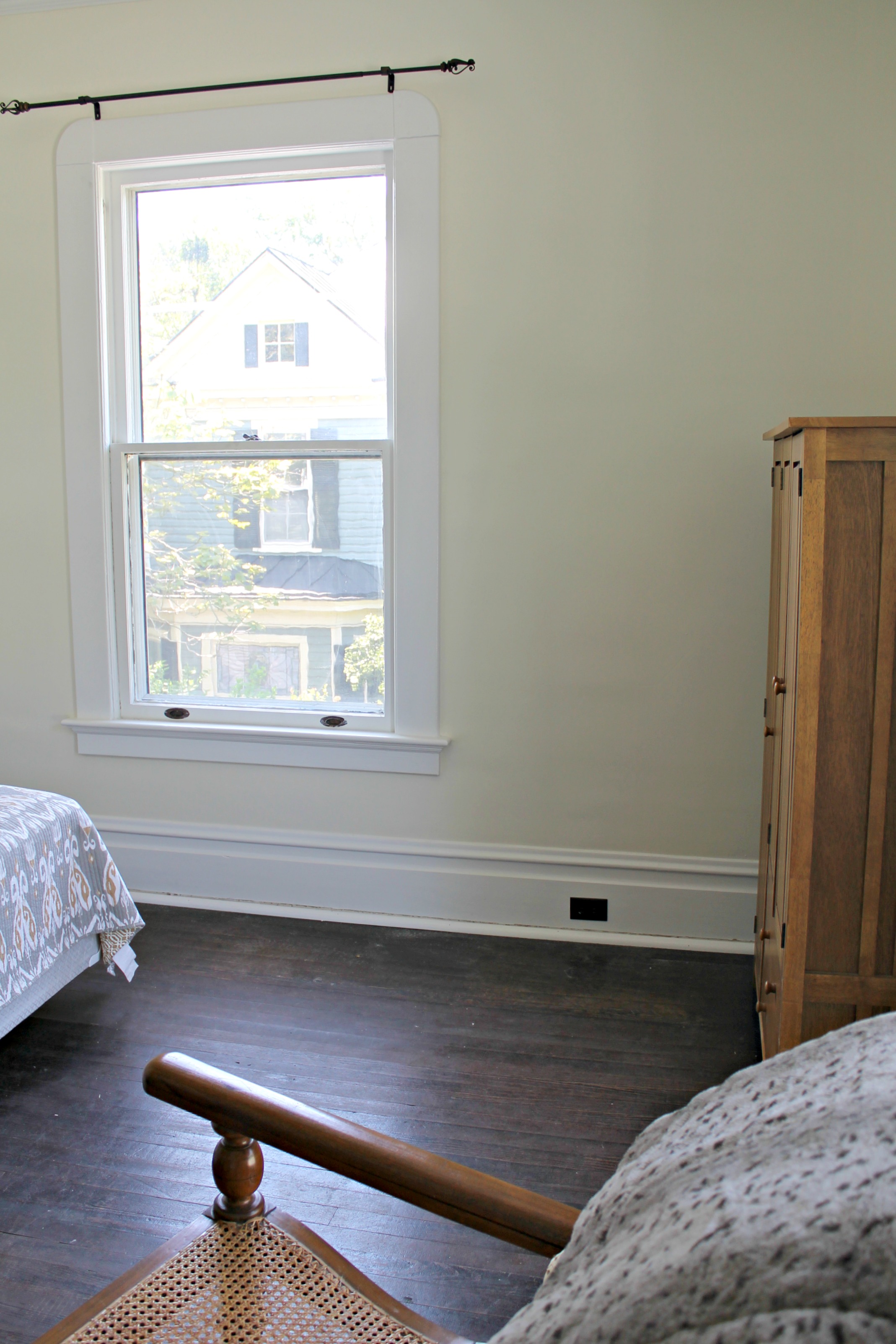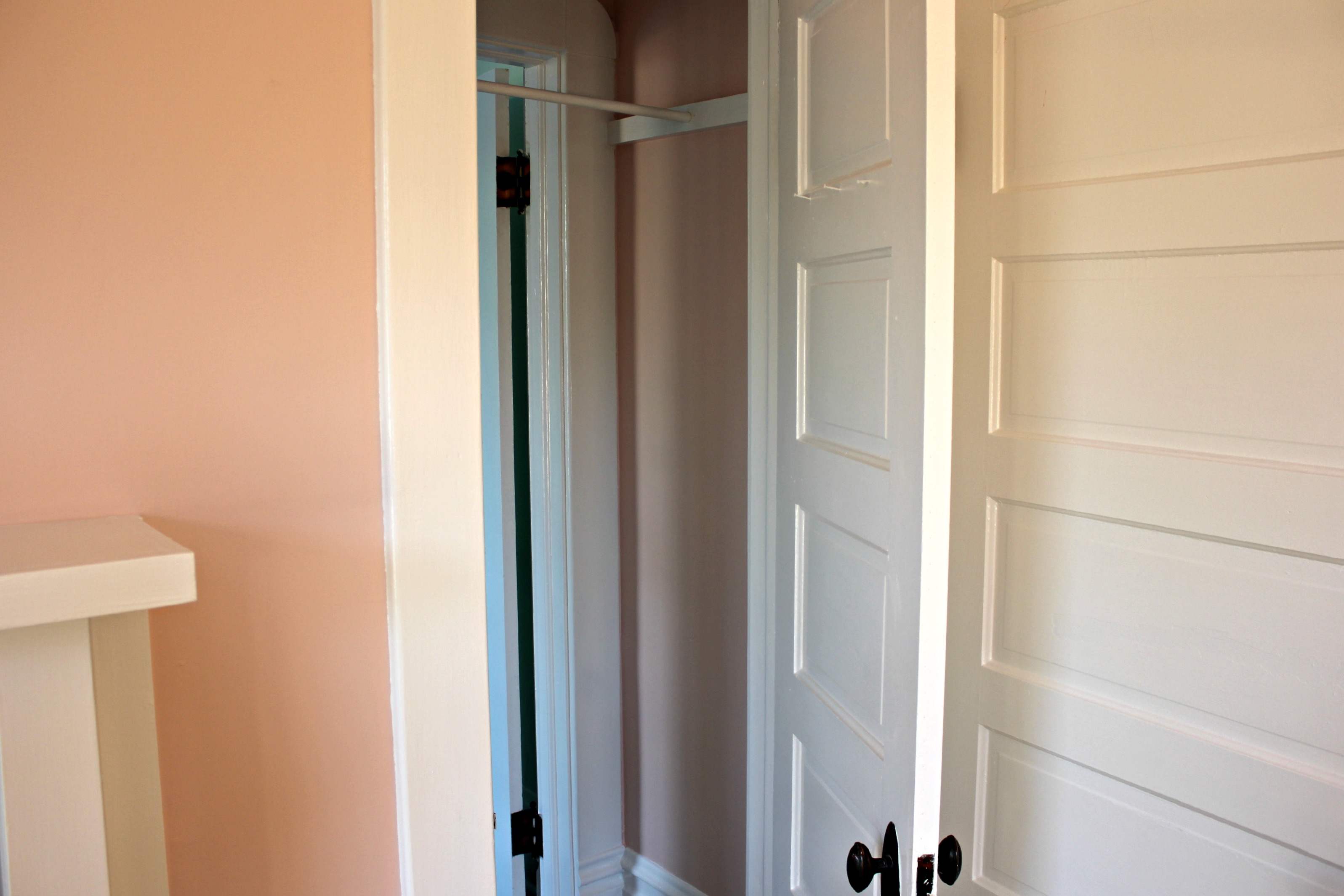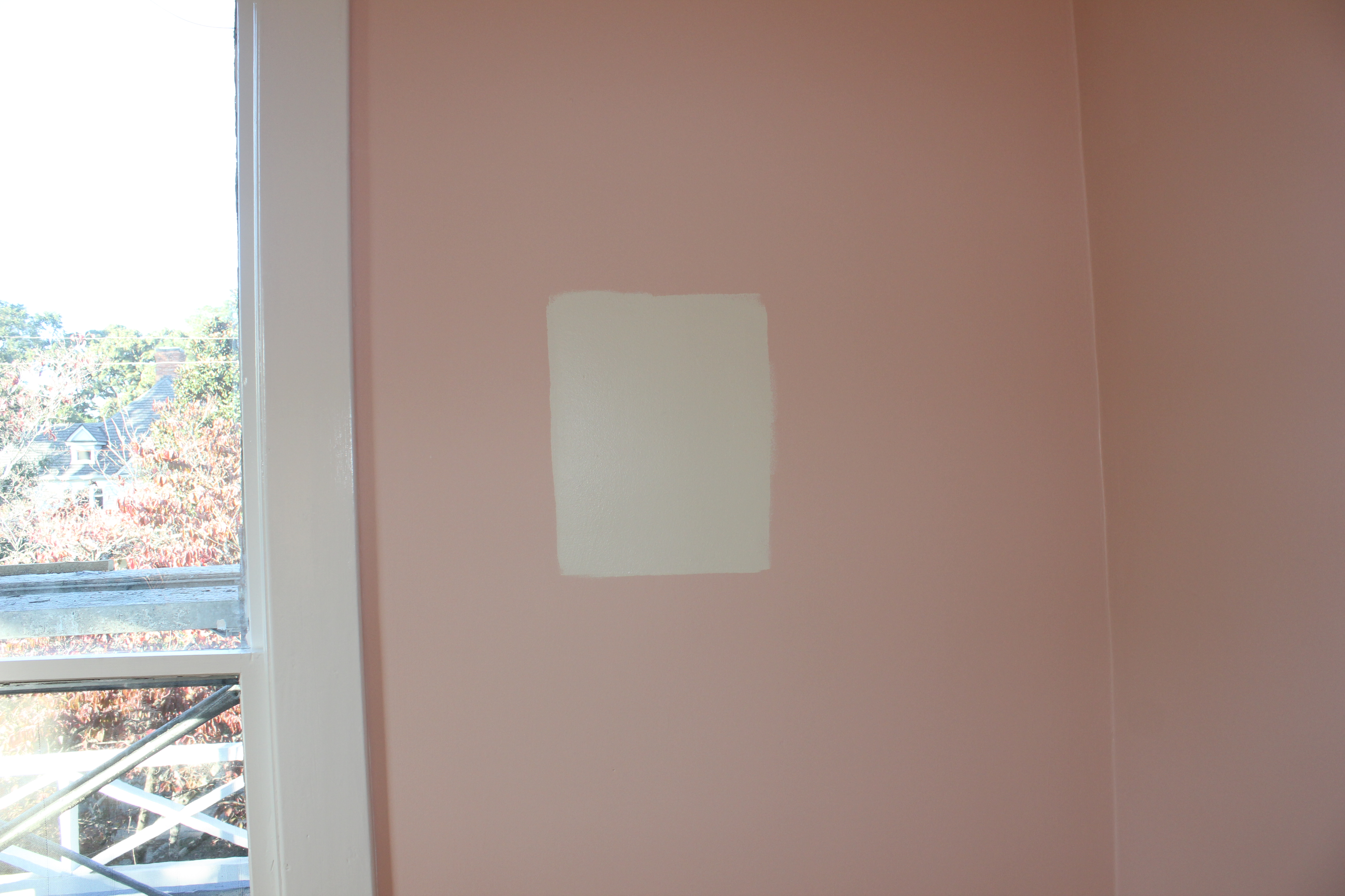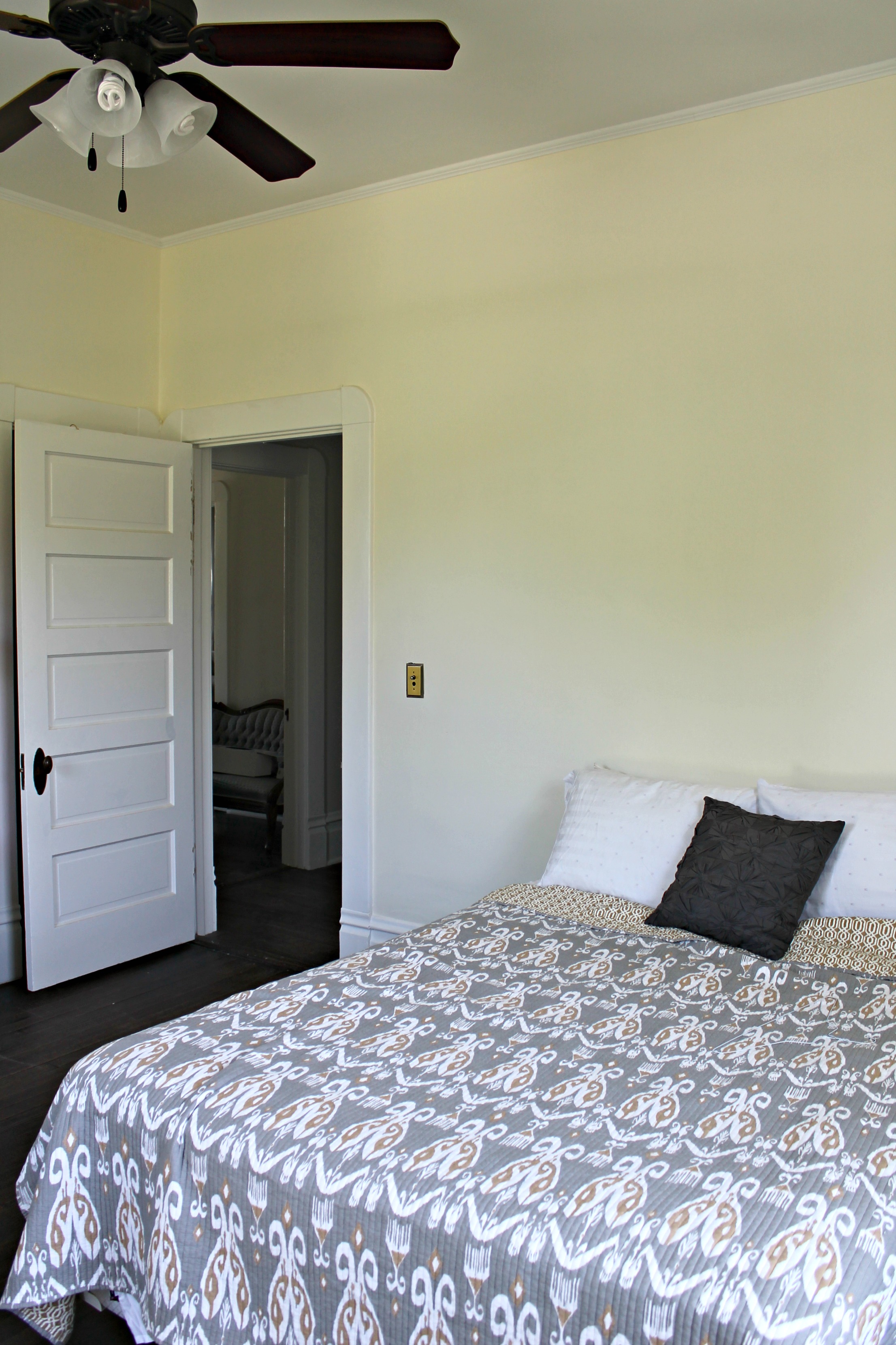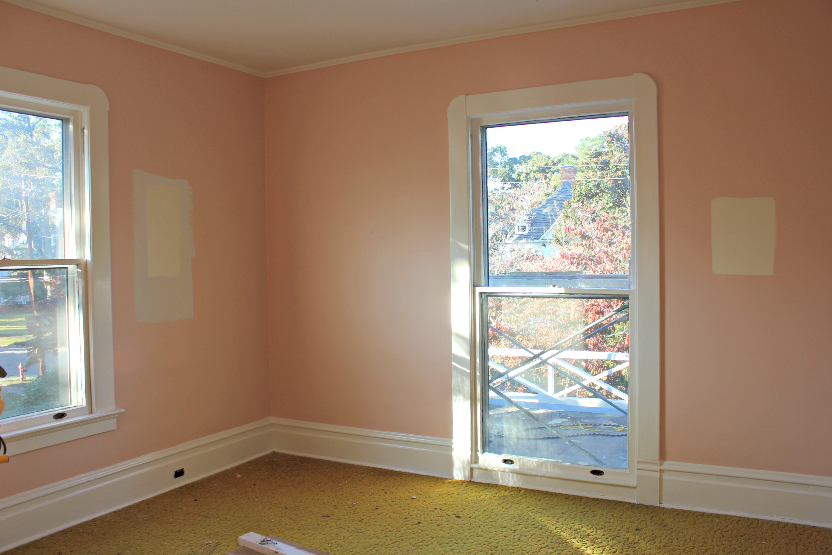 This room was professionally painted, and there was some miscommunication about the color choice. We had tried out Orange Bisque by Glidden but it was too salmony for Charles. So we decided to go with Del Mar Shores by Glidden instead. Apparently the painter didn’t get the memo because we came home to a wonderfully painted salmon guest room. Eventually it all worked out and we got the pale yellow we had asked for.
