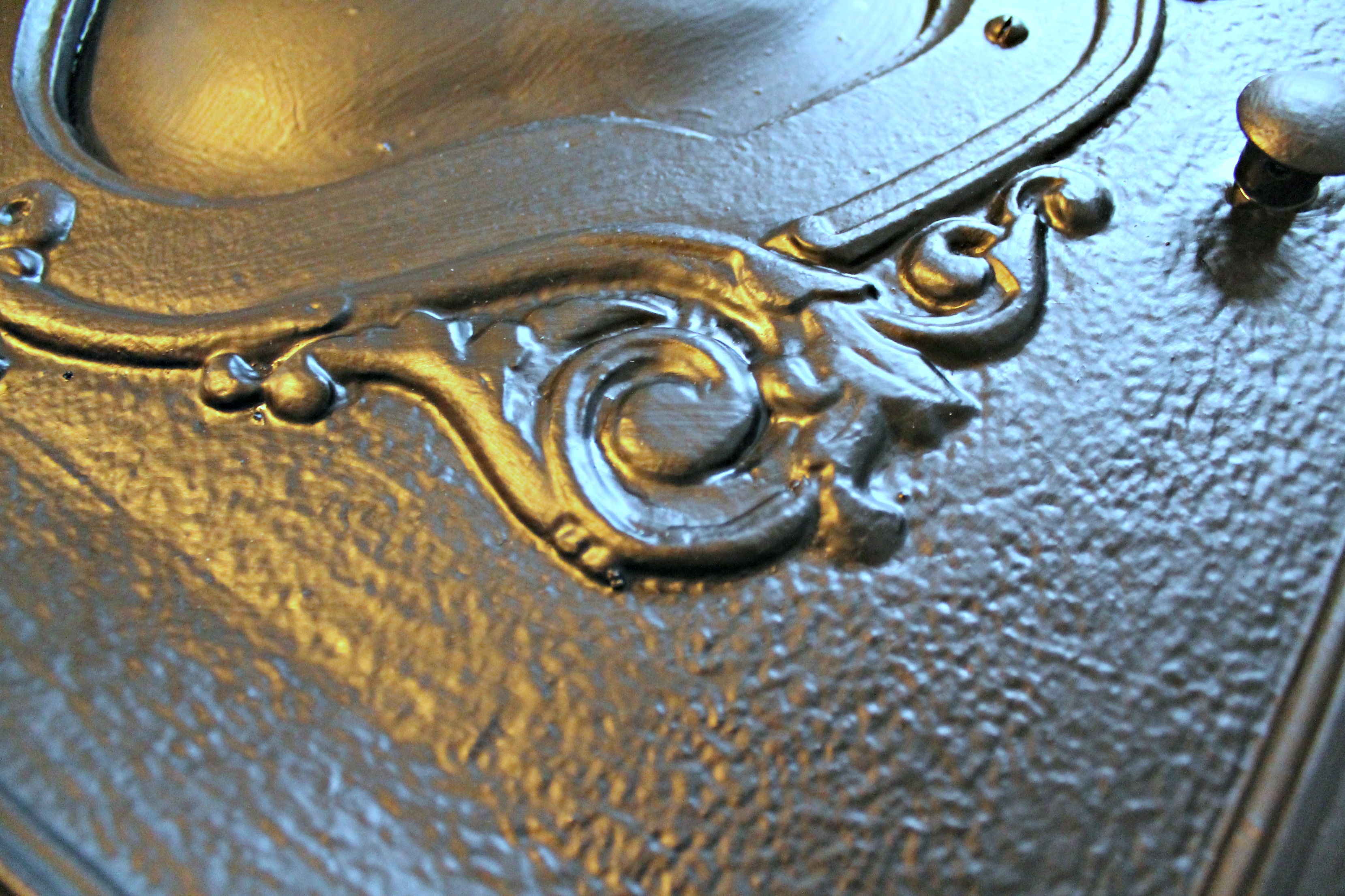 So we took the Rustoleum to them just like we did the tubs. We took off the doors and sanded, primed, and painted them in a glossy black Rustoleum paint. We also painted the inlays right where they were by taping them off and using the same method.