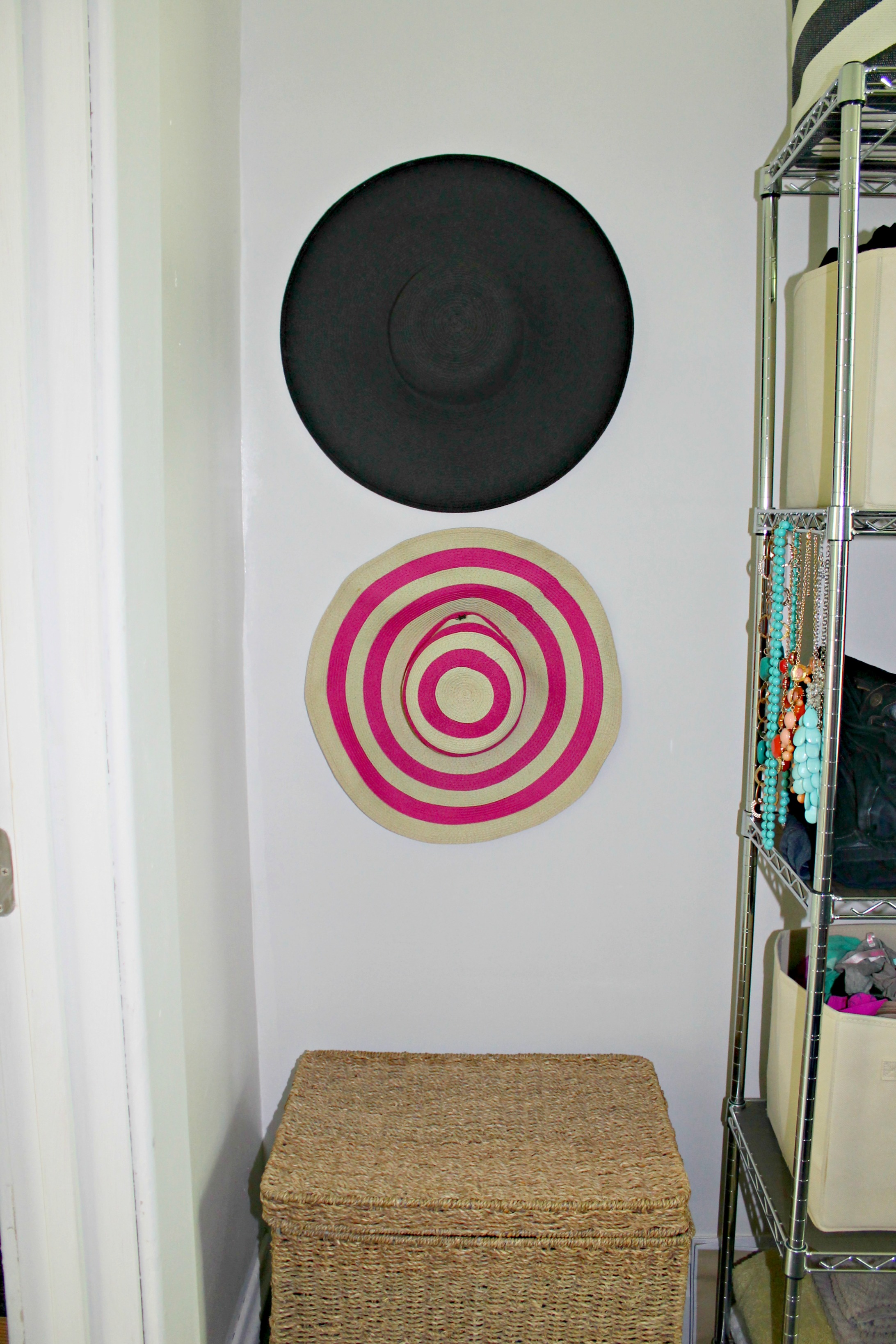 Lastly, we needed a little color in the closet, so I hung two of my sun hats on the wall. It’s a really cute, inexpensive way to add a little “art” to a small space. All you need are a couple of 3M hooks!