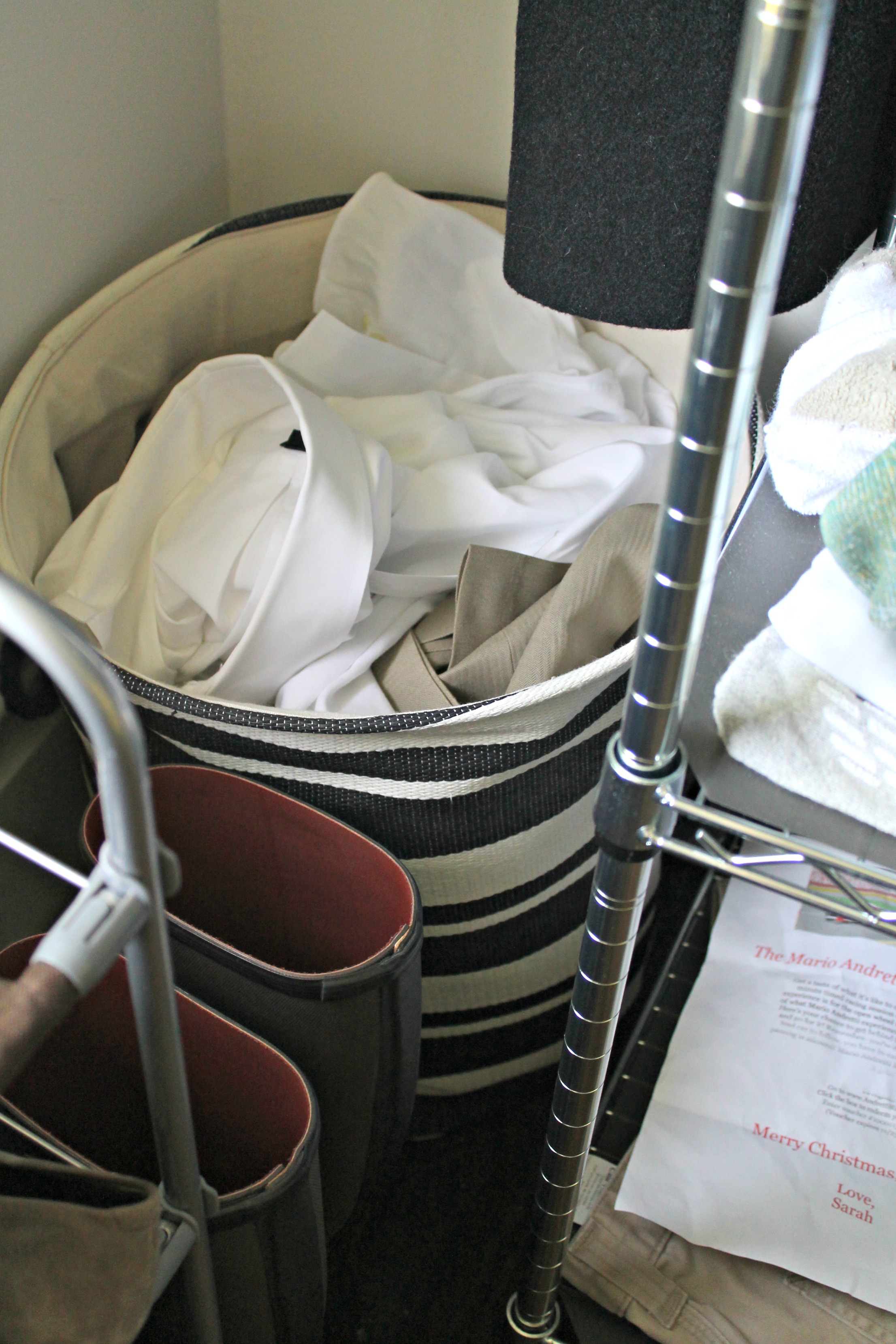 We each had old shoe racks that we decided to keep, and the laundry basket was a wedding gift. I also picked up this cute striped bin from TJ Maxx to nestle in the corner for our dry cleaning pile.