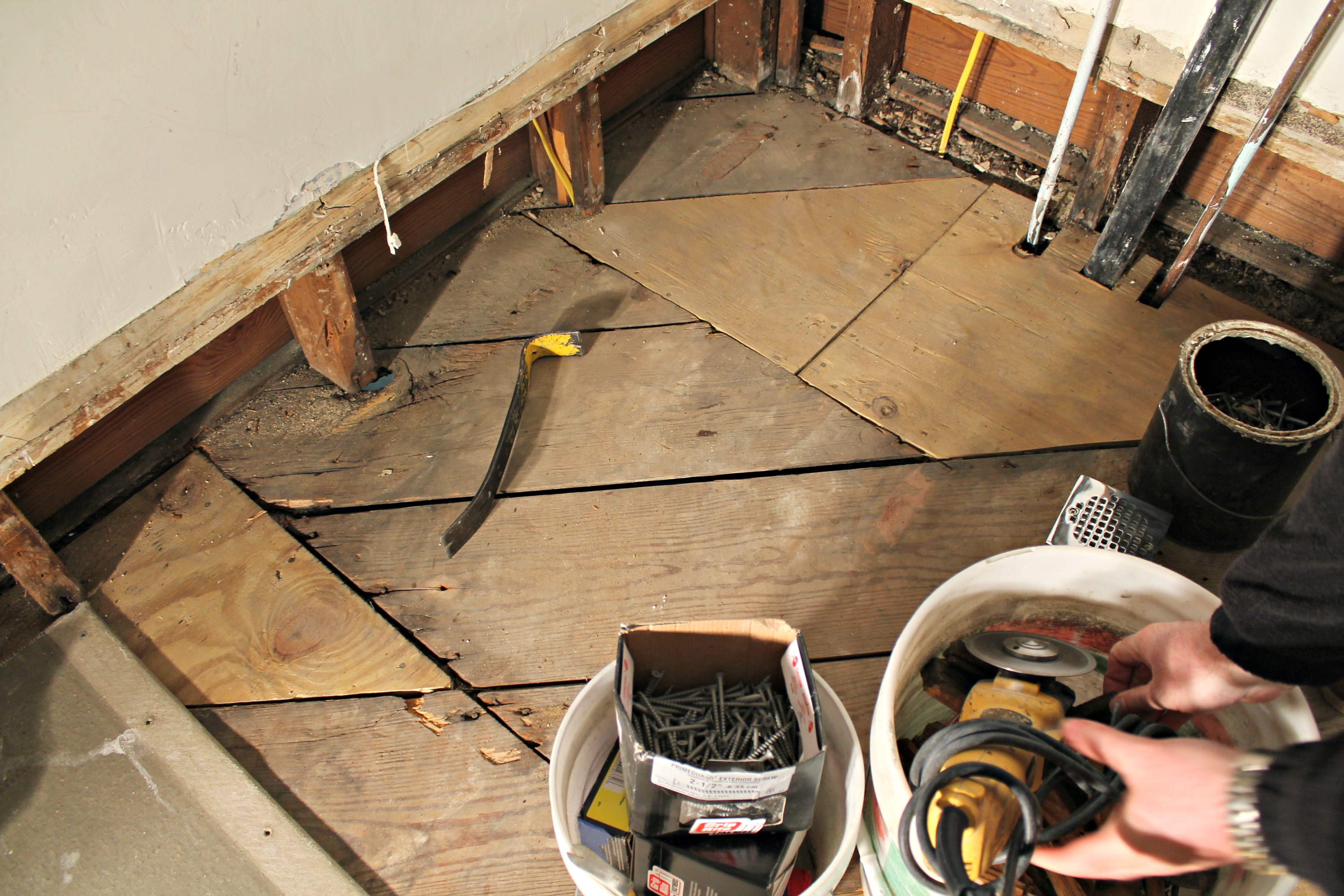 Our laundry room has come a long way from where we found it. The paint, plaster, and vinyl flooring were in seriously bad shape, and the floor beneath the vinyl was completely rotted through in the corner due to a leak.
