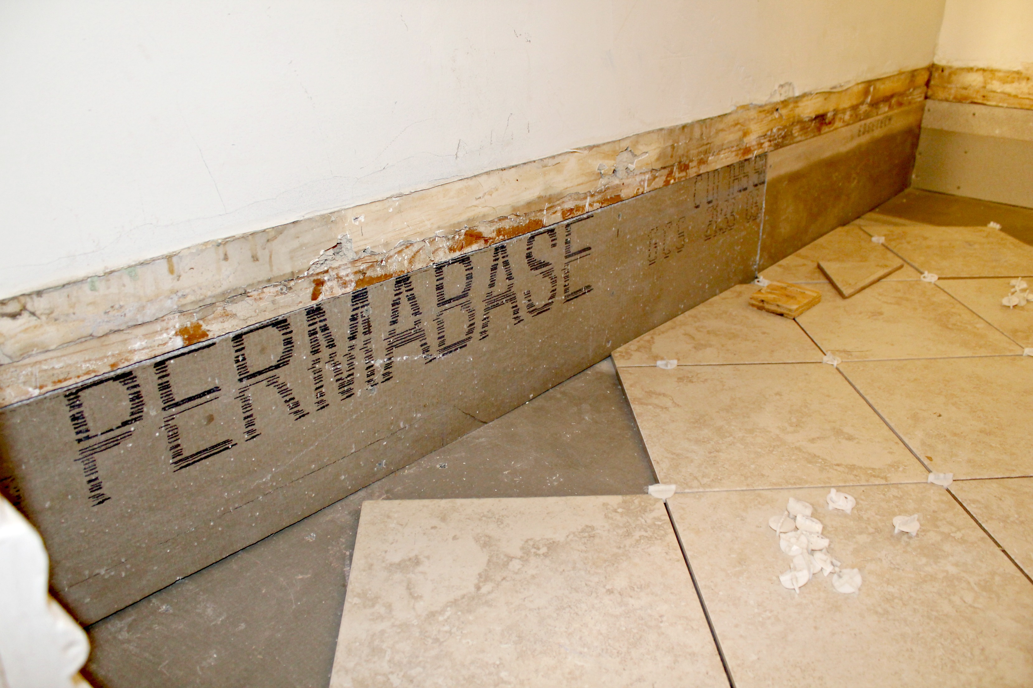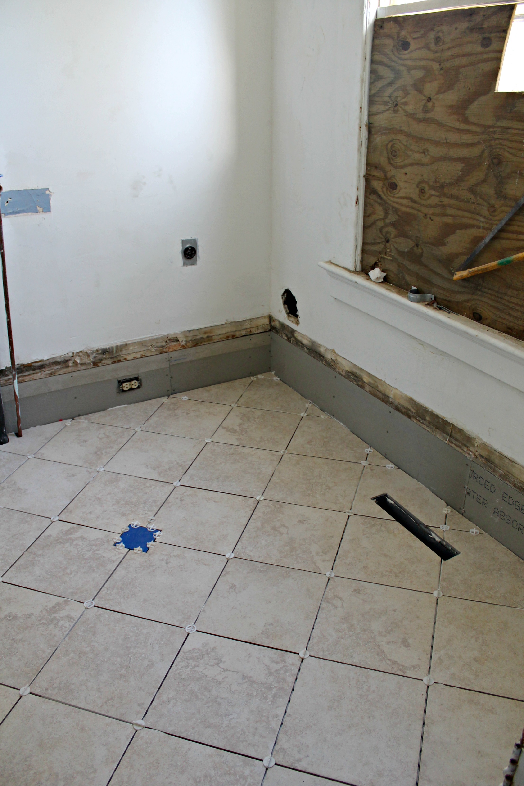 We pulled up all of the vinyl floor, cut out the rotten wood in the corner, and basically laid a new sub floor. Then we tiled the floor, and installed a drain in the center. The drain was easily some of the best money we’ve spent…the first time we used our washer it flooded, but no big deal — we had a drain! No floor damage! If you’re thinking of reflooring your laundry room, I would highly recommend installing a drain!