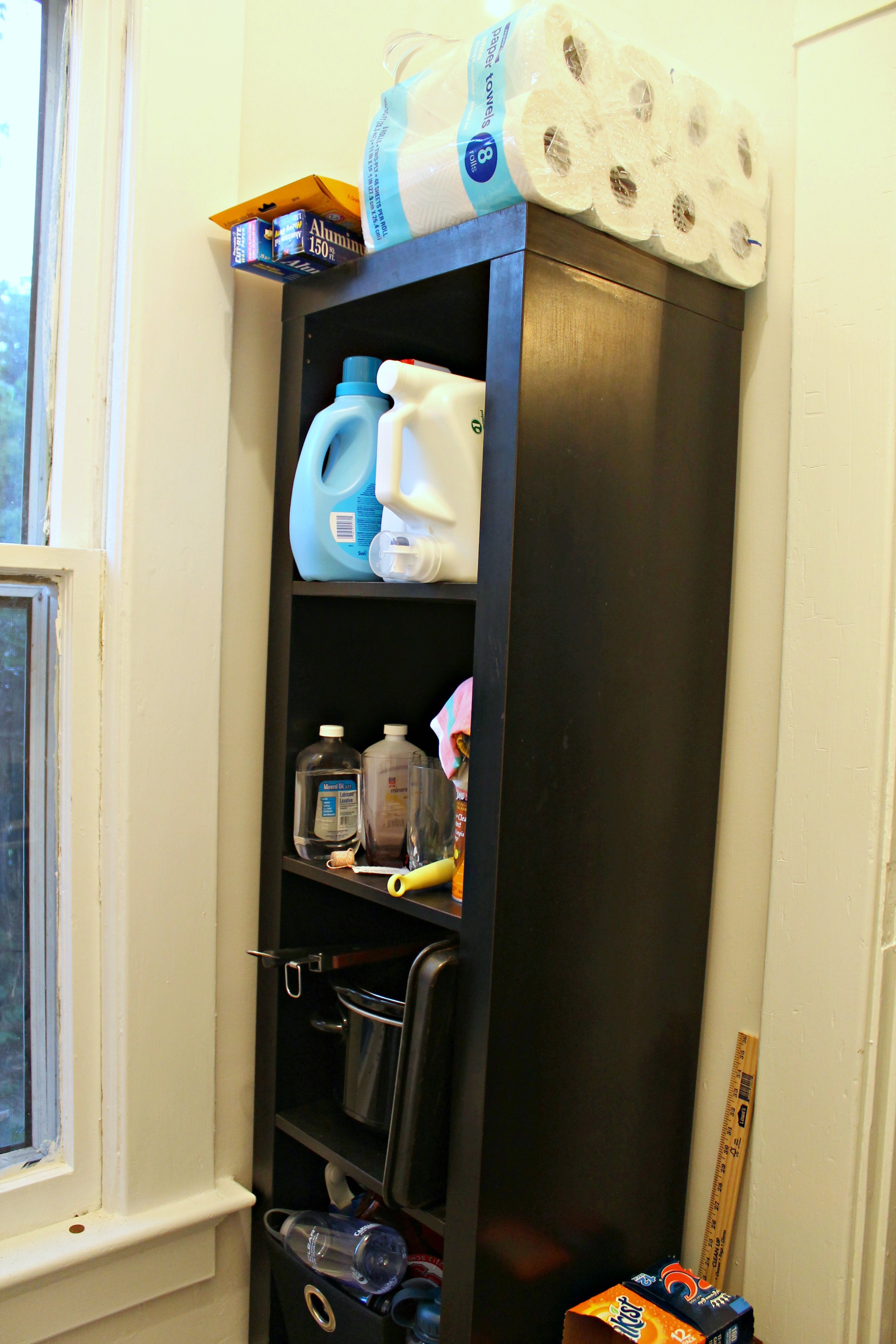 The ceilings are 11 feet tall in this room, so we definitely plan to install some cabinets above the washer and dryer. And a countertop is a must. The room isn’t very large, so more folding space would be great. I’d also like to replace the cheap, hand-me-down Ikea shelf with a pull-out drying rack. Here are a few ideas I like (click on the photo for source).