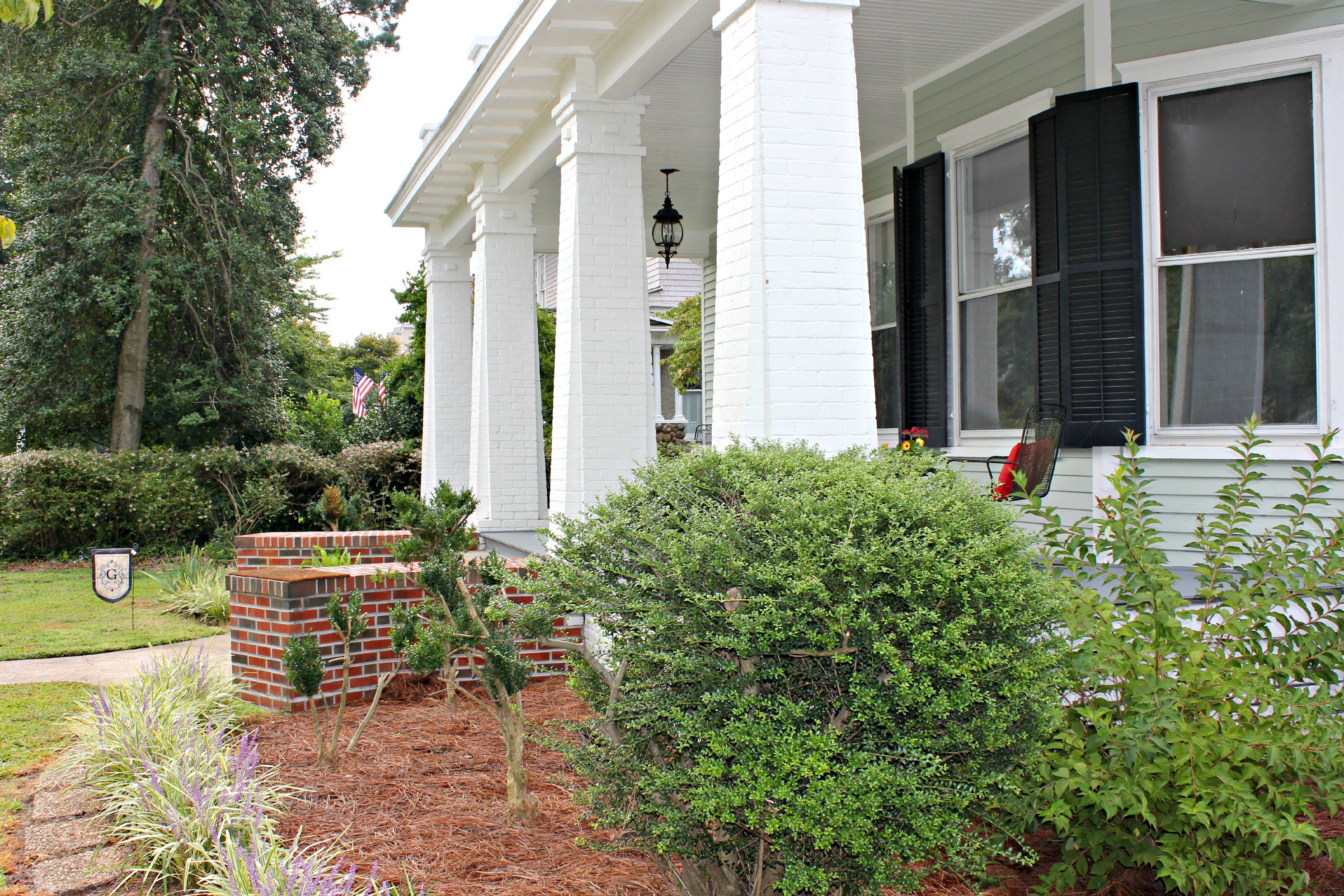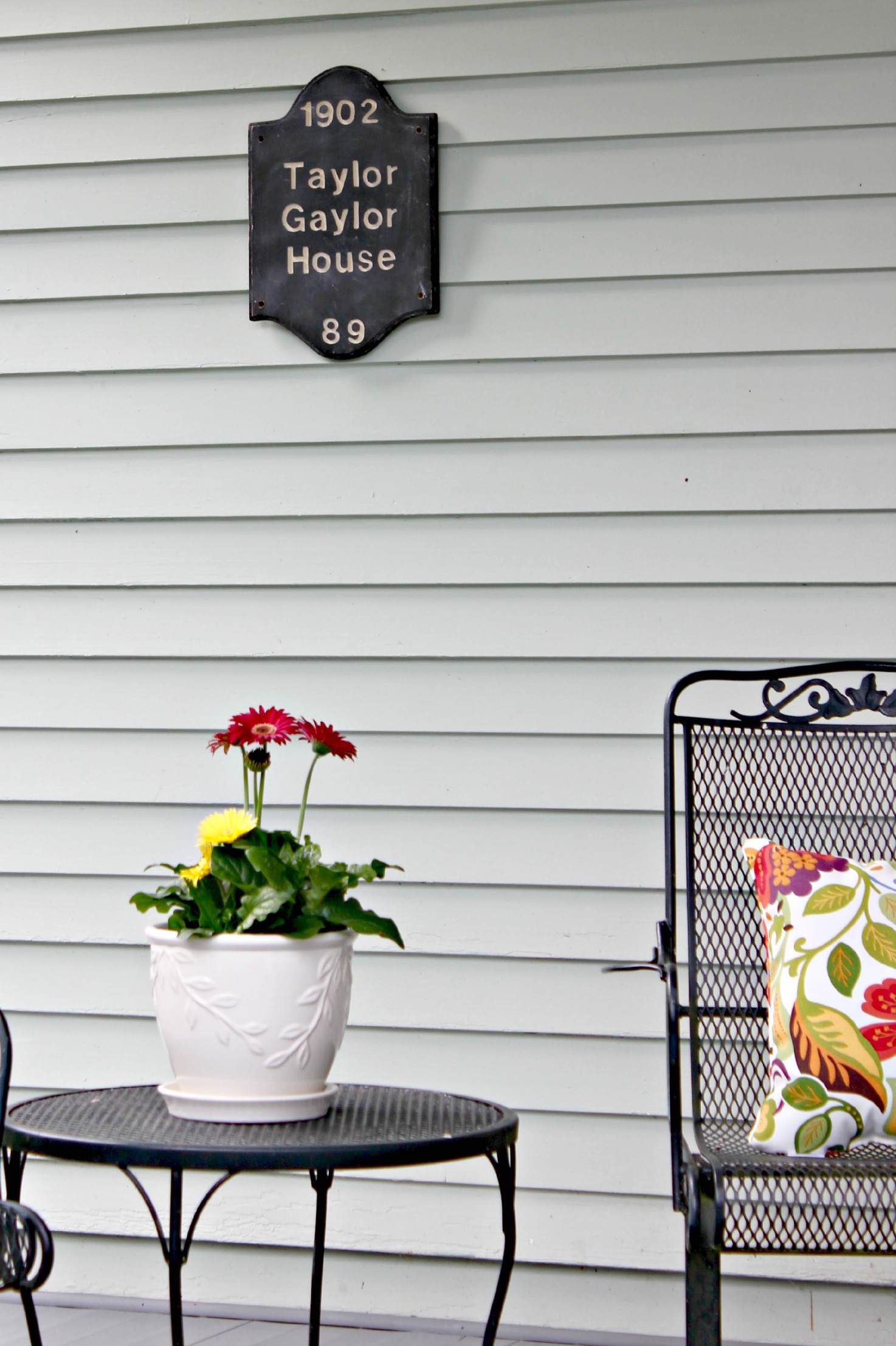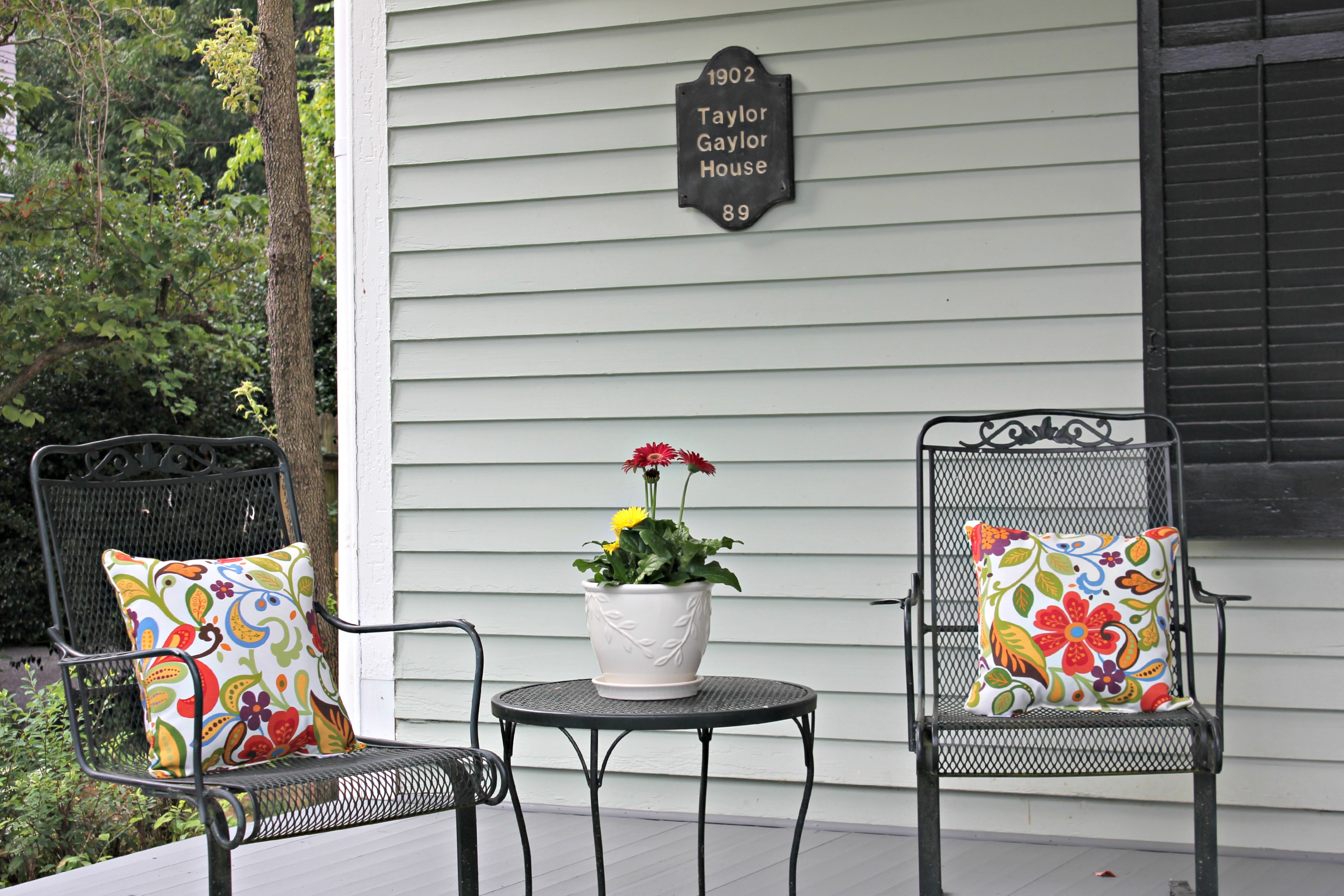 Next, we hung the historic marker and mailbox, and added a couple sets of chairs with tables and potted flowers.  Eventually we’d like to have big rocking chairs on one side of the front porch and a porch swing on the other.  But thanks to Charles’ parents, we got to use these sets for free. :)
