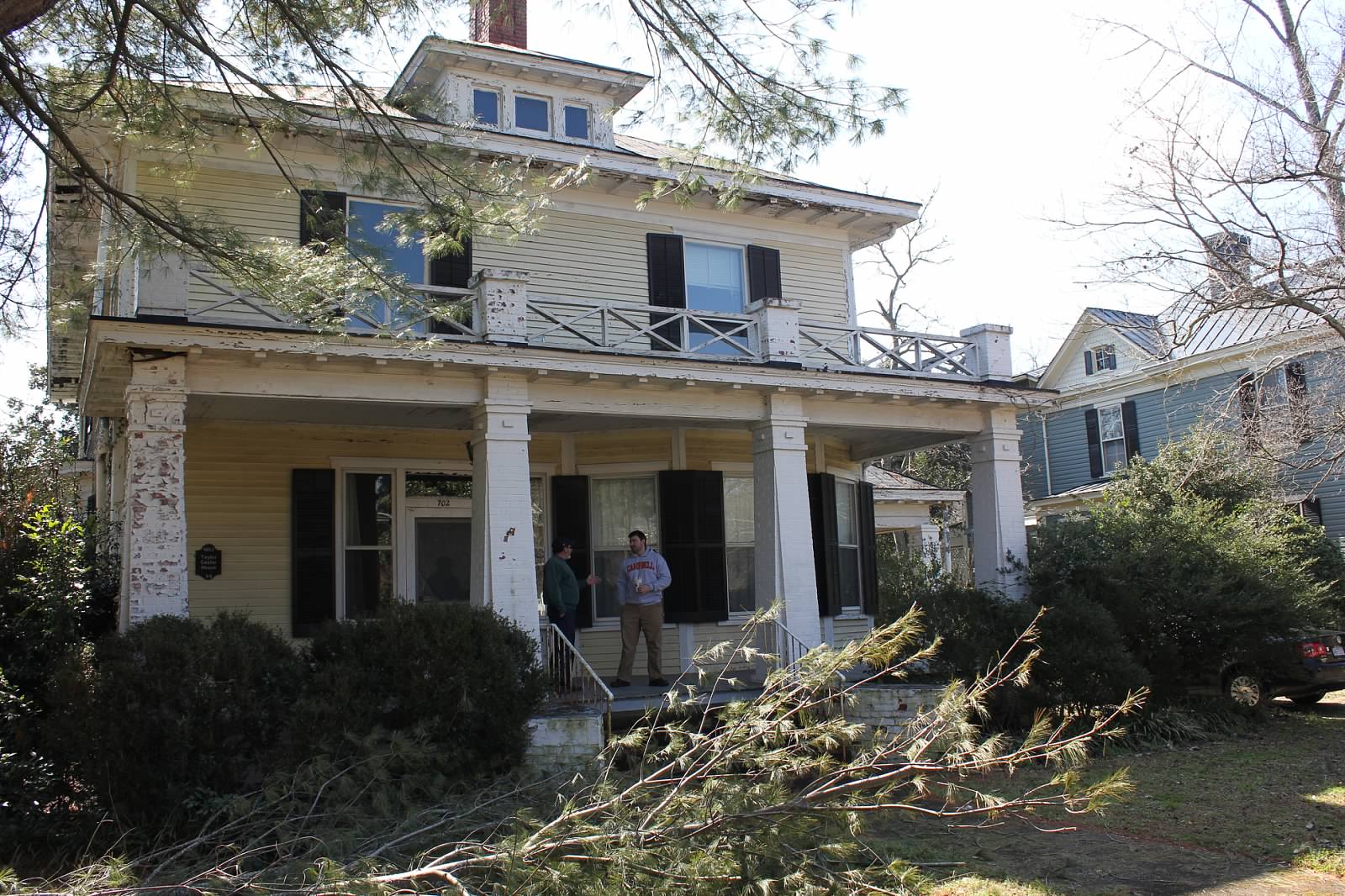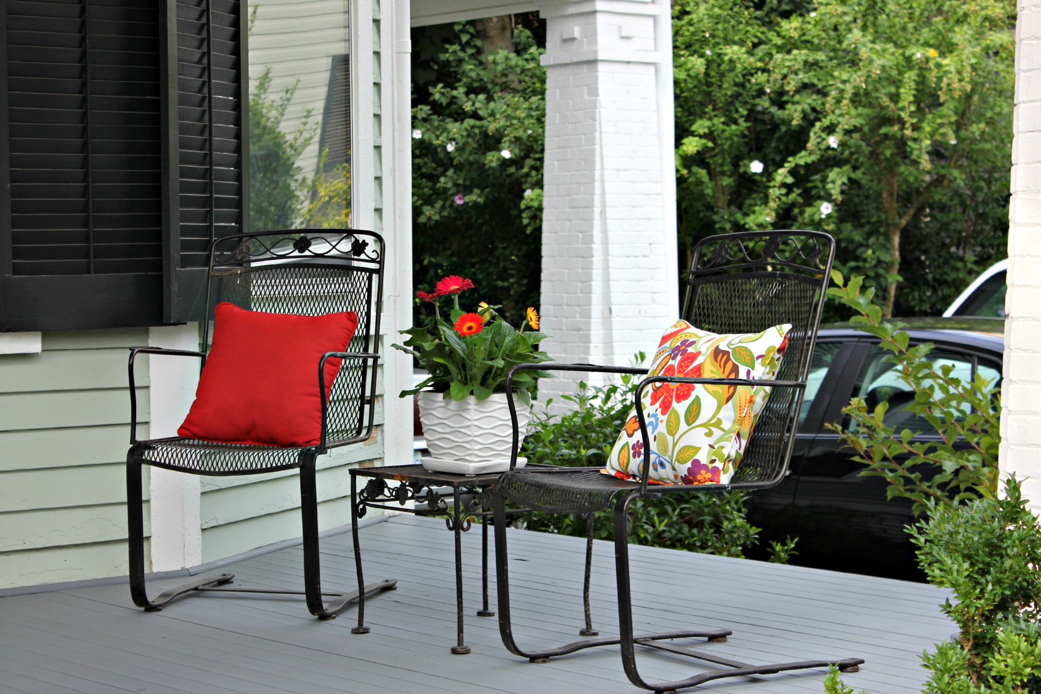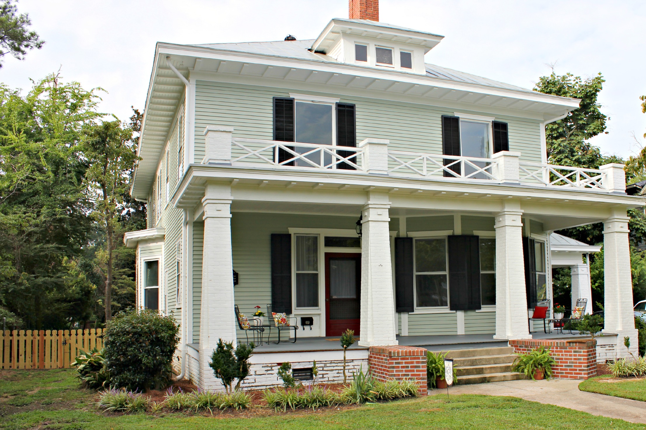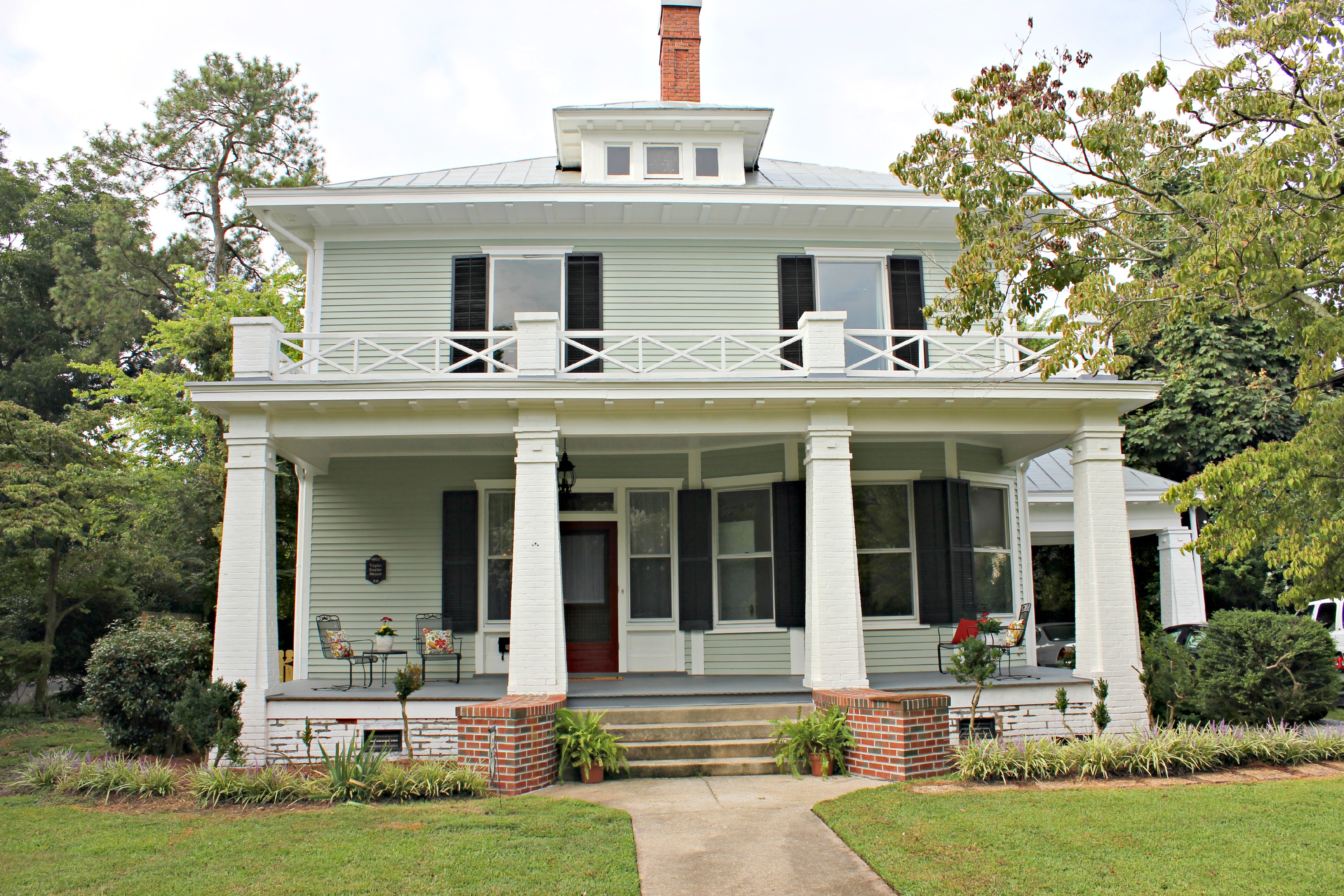Next, we hung the historic marker and mailbox, and added a couple sets of chairs with tables and potted flowers.  Eventually we’d like to have big rocking chairs on one side of the front porch and a porch swing on the other.  But thanks to Charles’ parents, we got to use these sets for free. :)