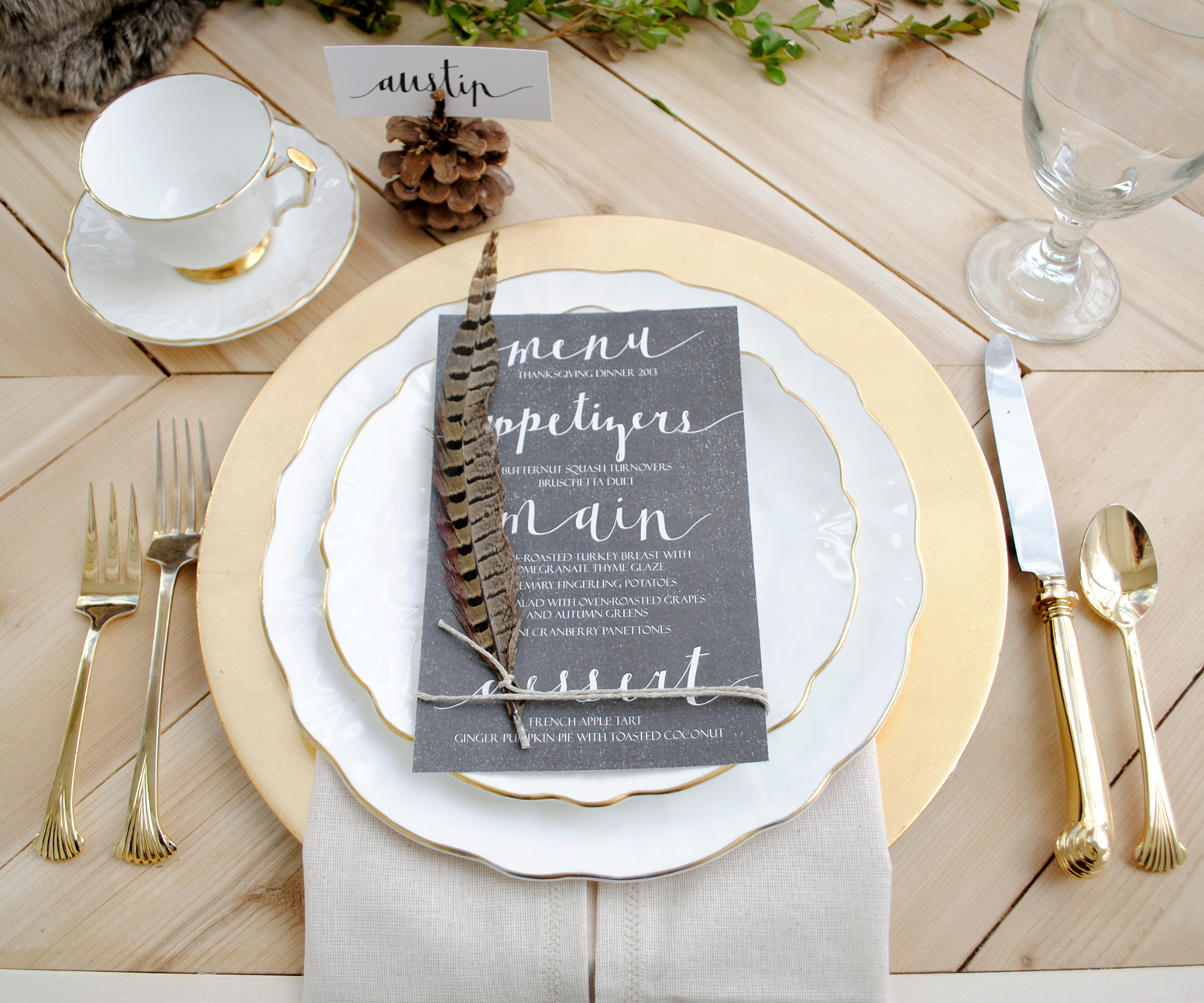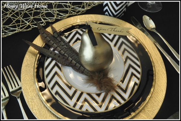 I love everything about this one.  The feathers, the pear, the plate patterns, the charger. Seriously, perfect.