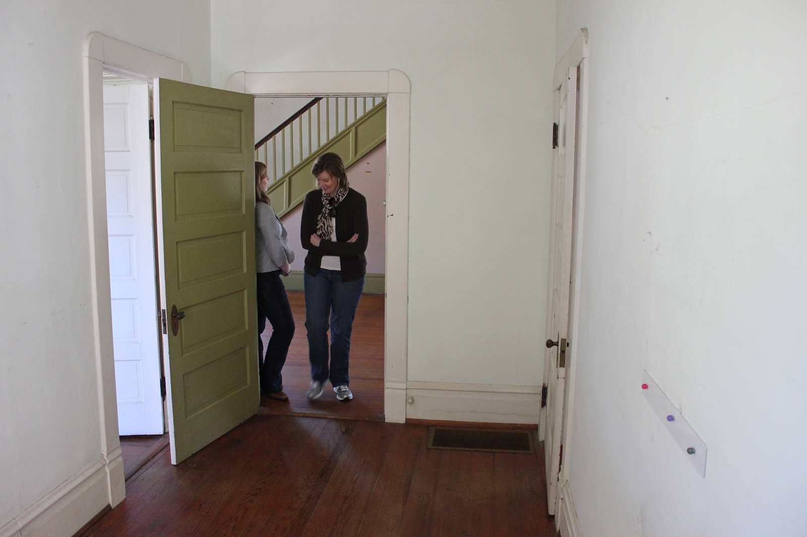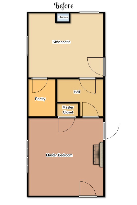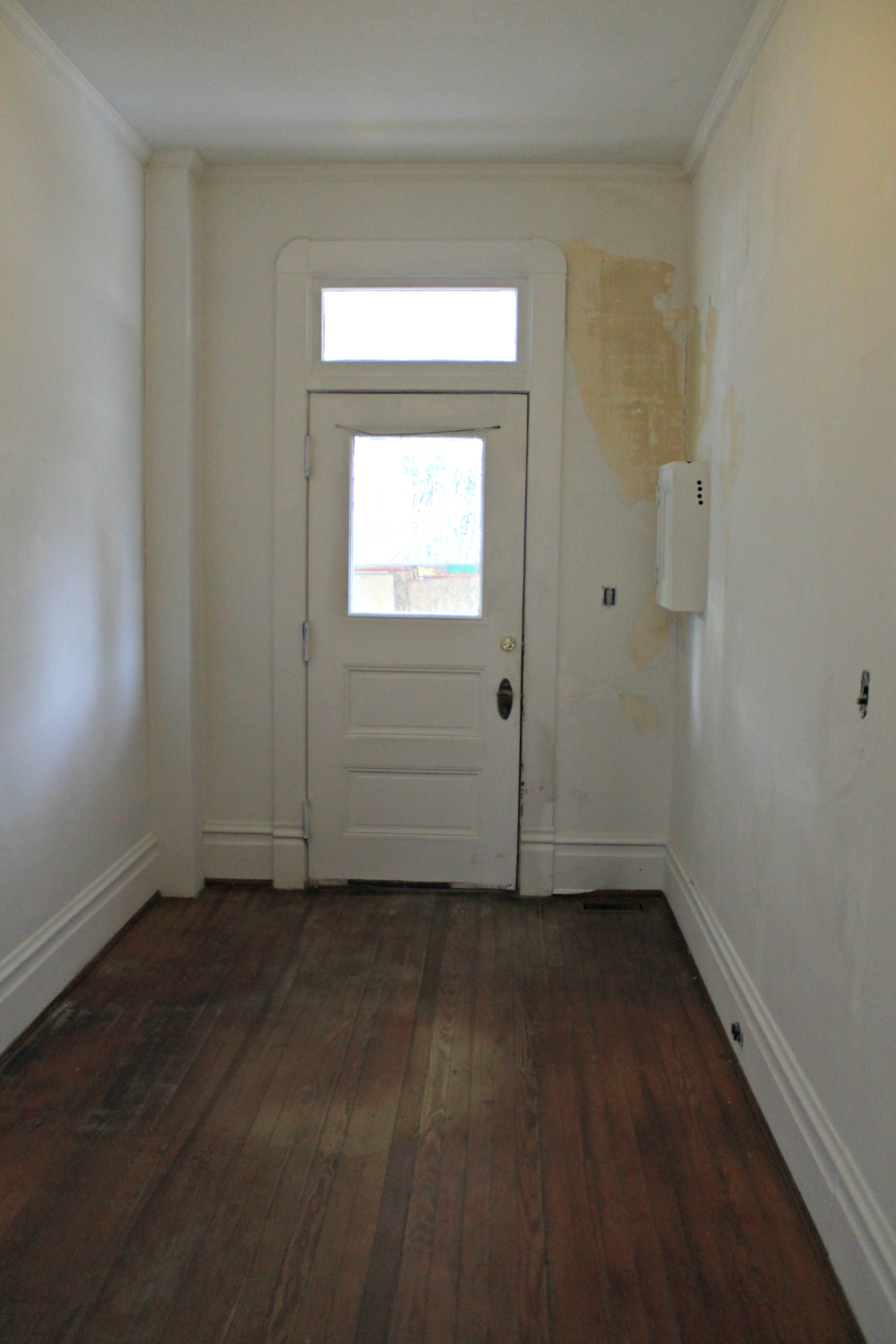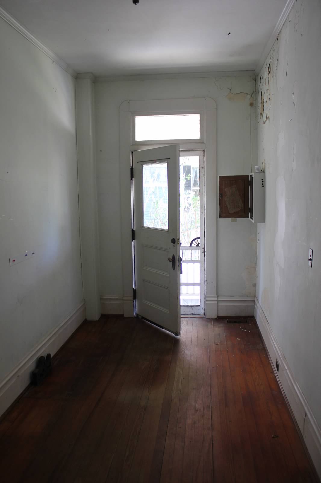 The figures…this room is 11′ x 15′ with 11′ ceilings. There are 2 windows, 2 interior doors, 1 chimney (no fireplace), and 1 exterior door leading to the back porch.