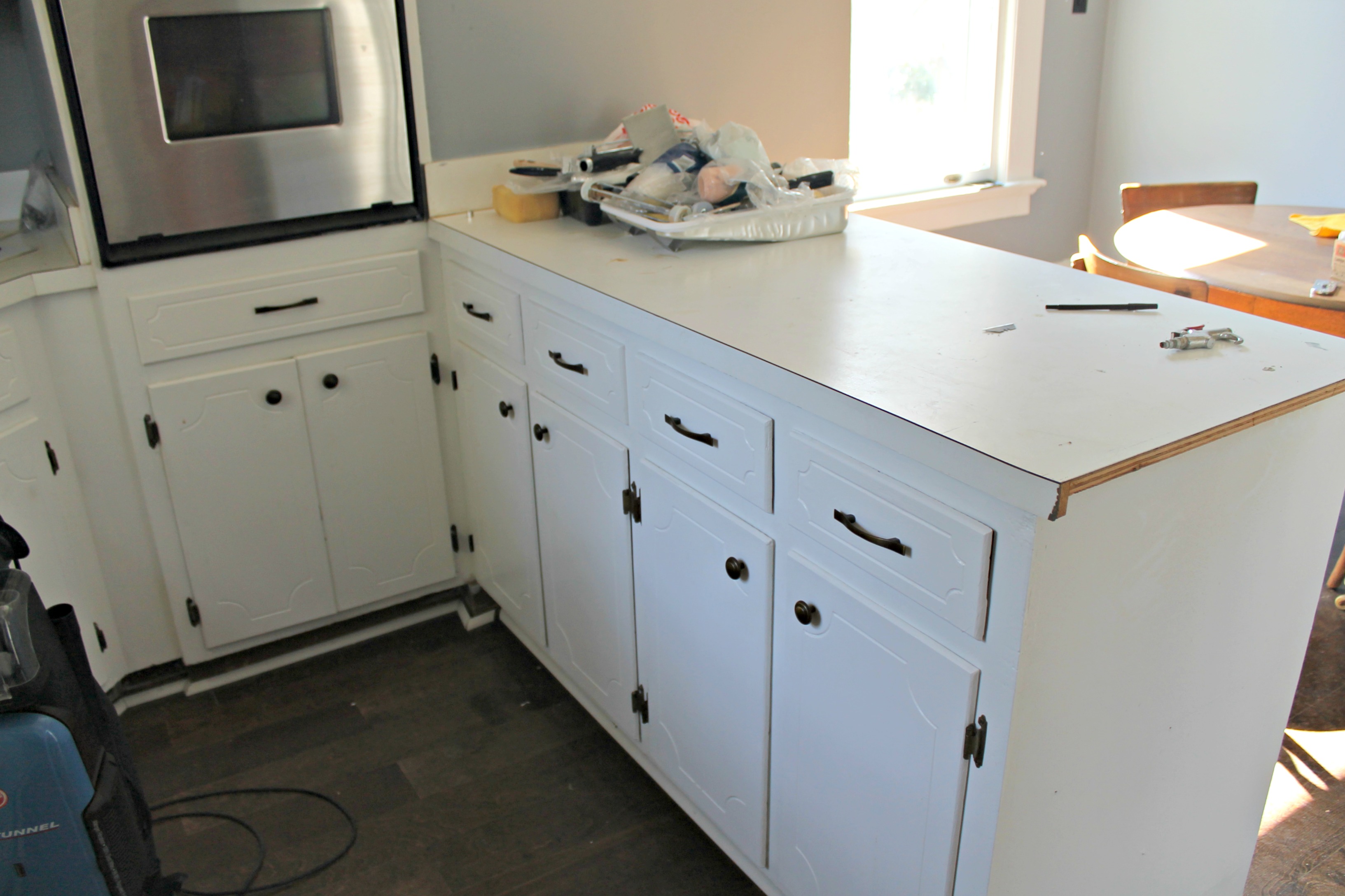 - Cut off rounded penninsula to make room for fridge
