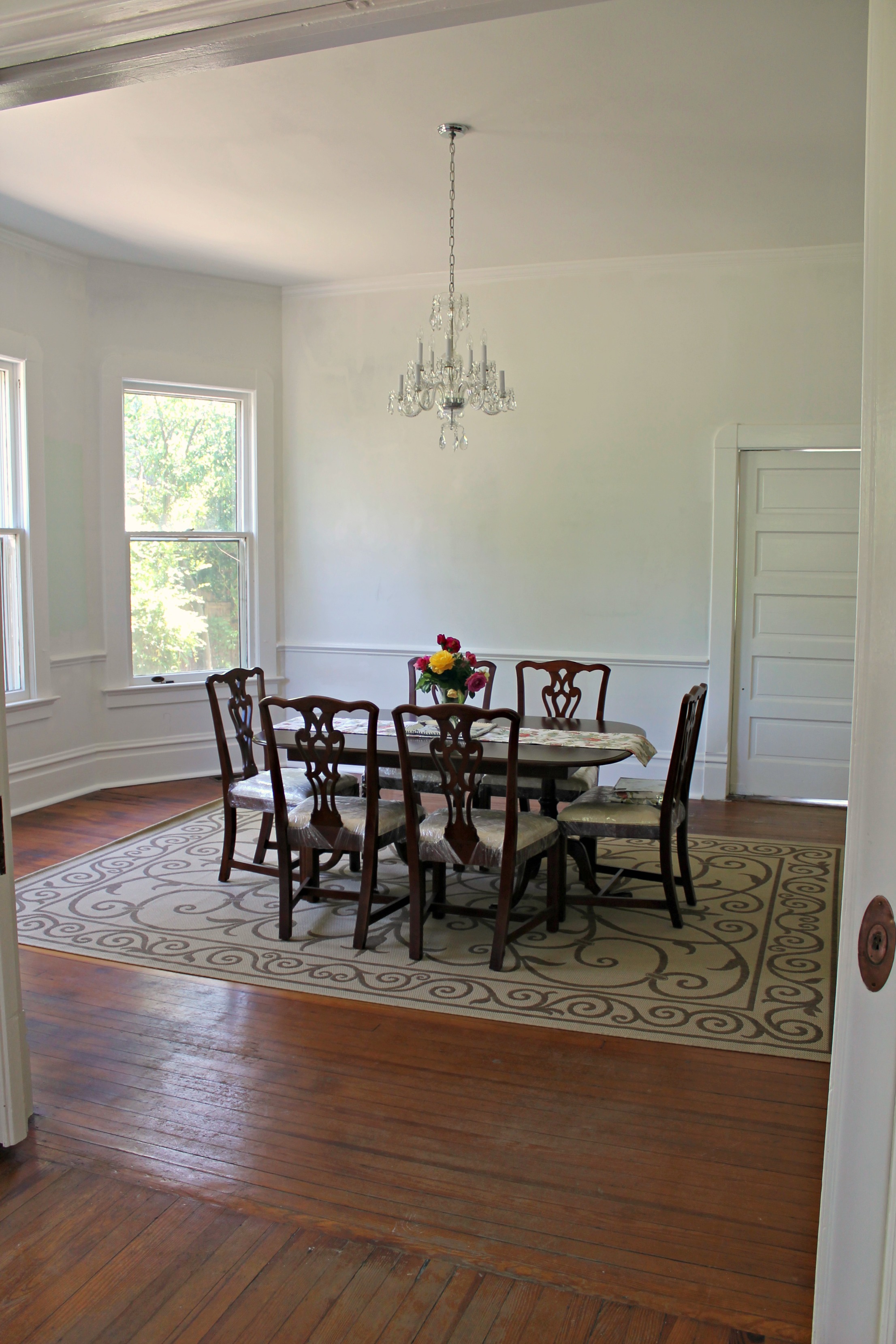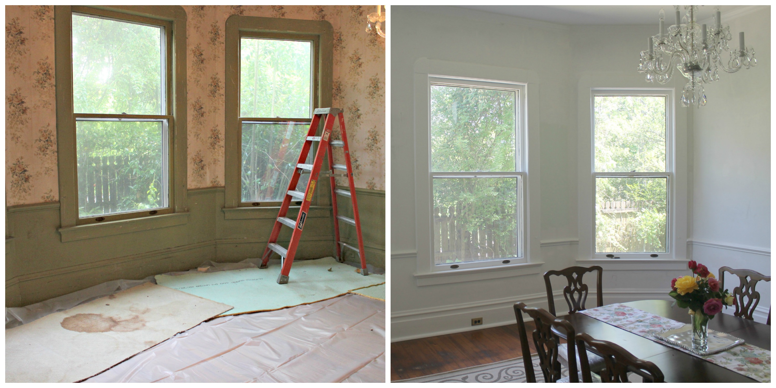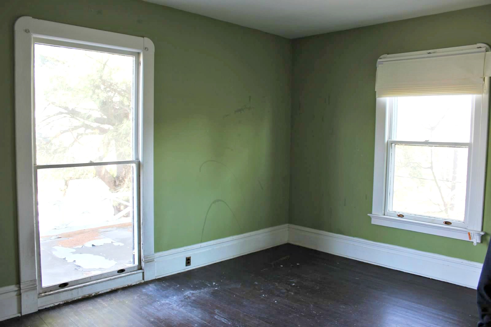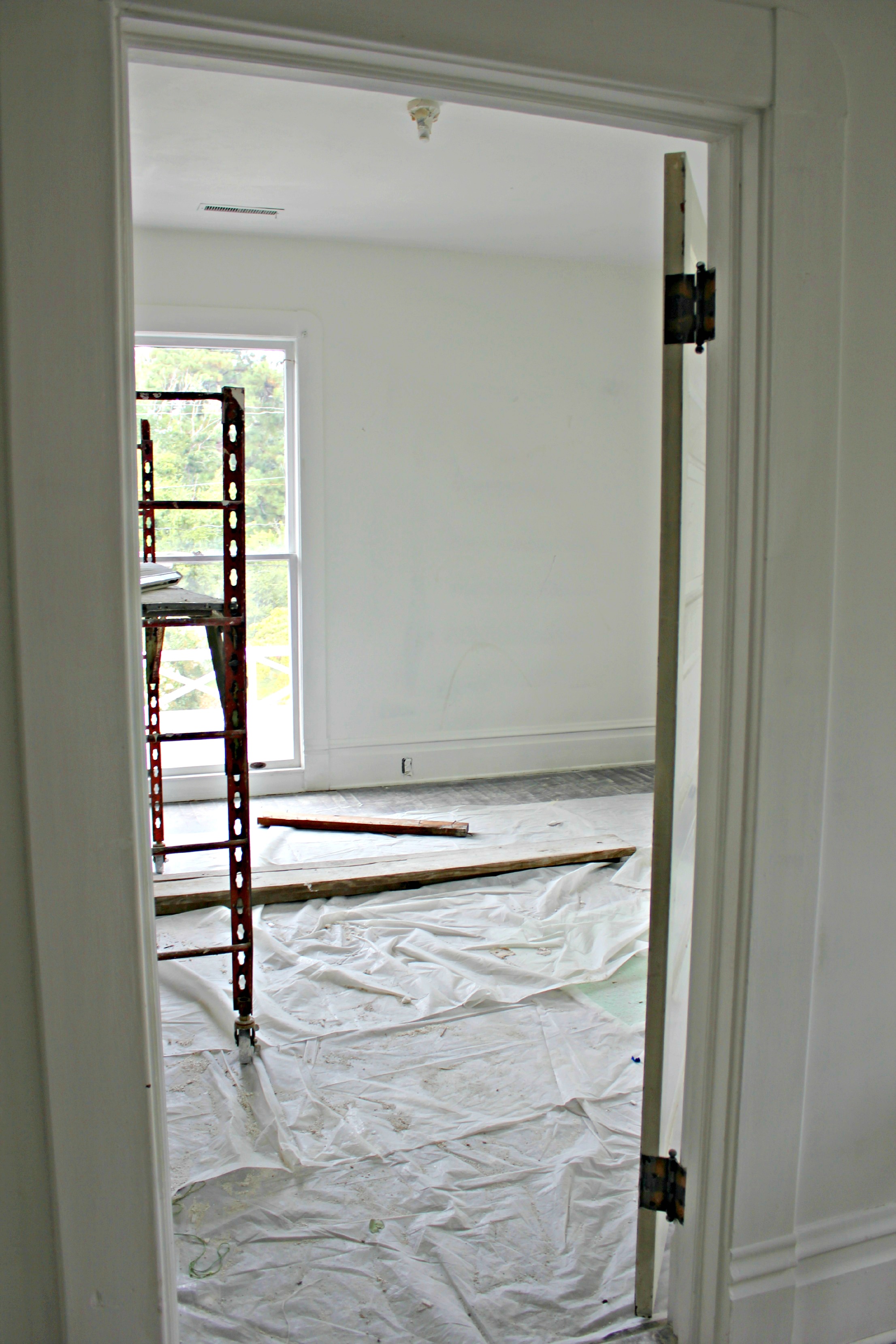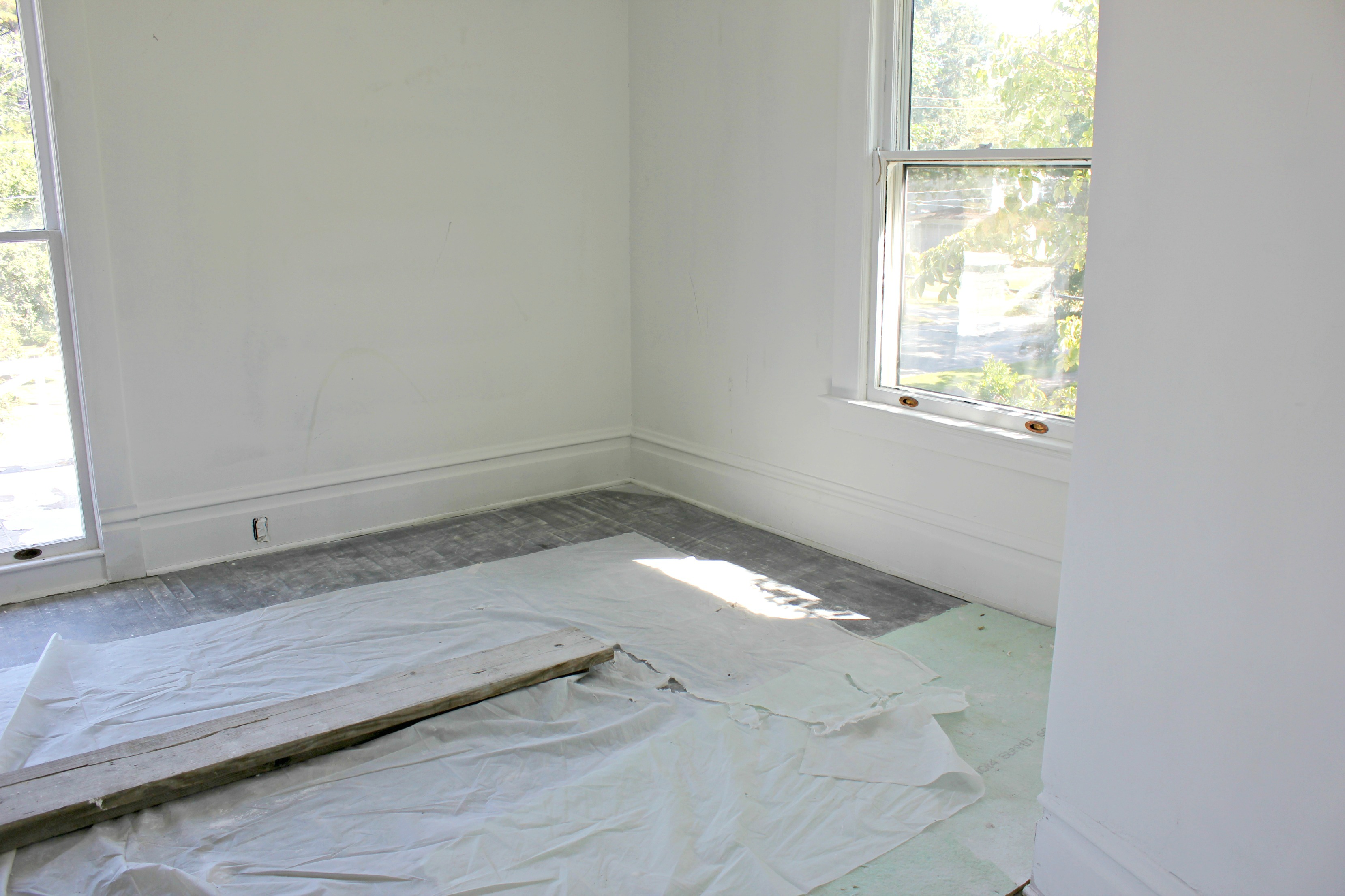 We painted the walls in Kitten White and the trim in a high gloss white. We had minor termite damage (no active termites – yay!!) in the floor, so we went ahead and filled that in to prevent further cracking. We will eventually get around to oiling and refinishing the floors.