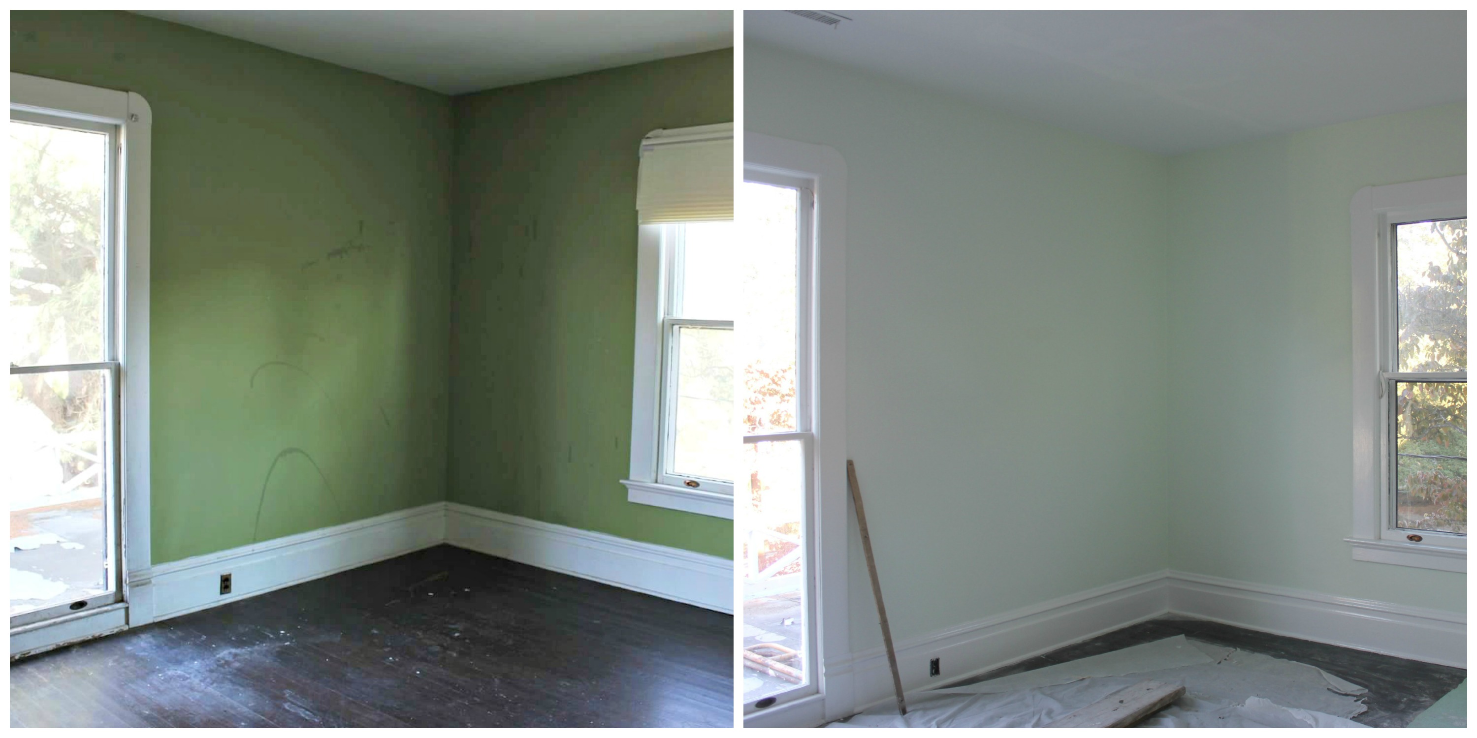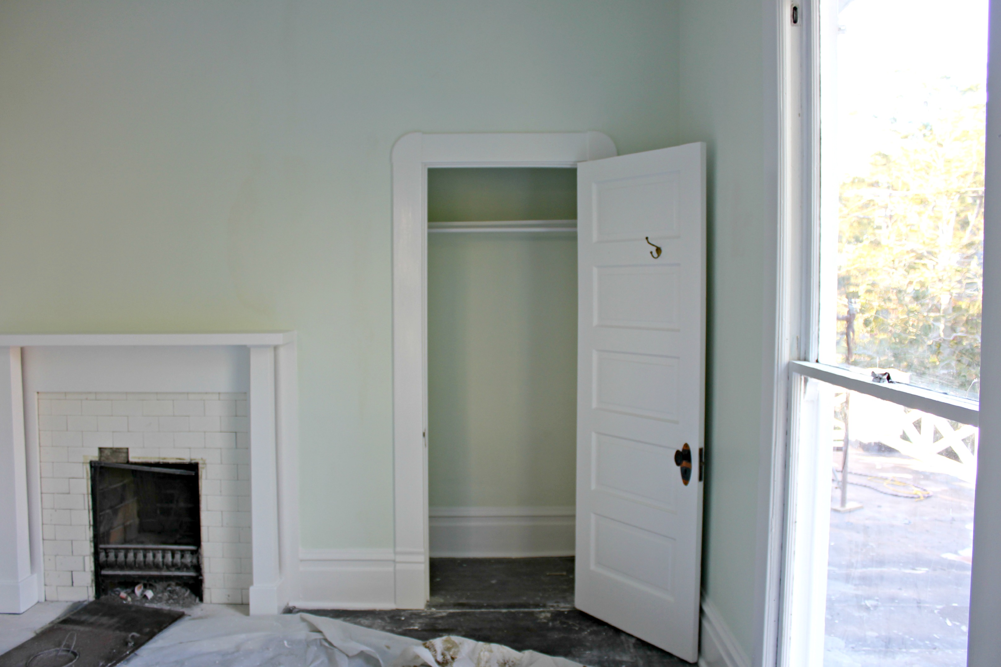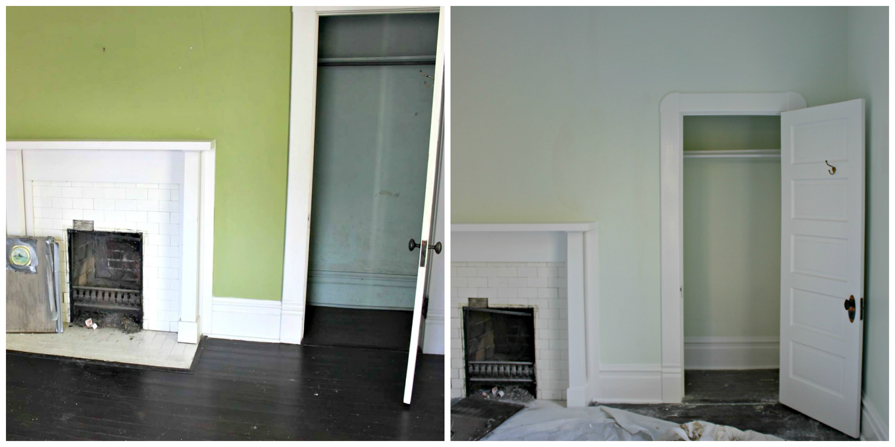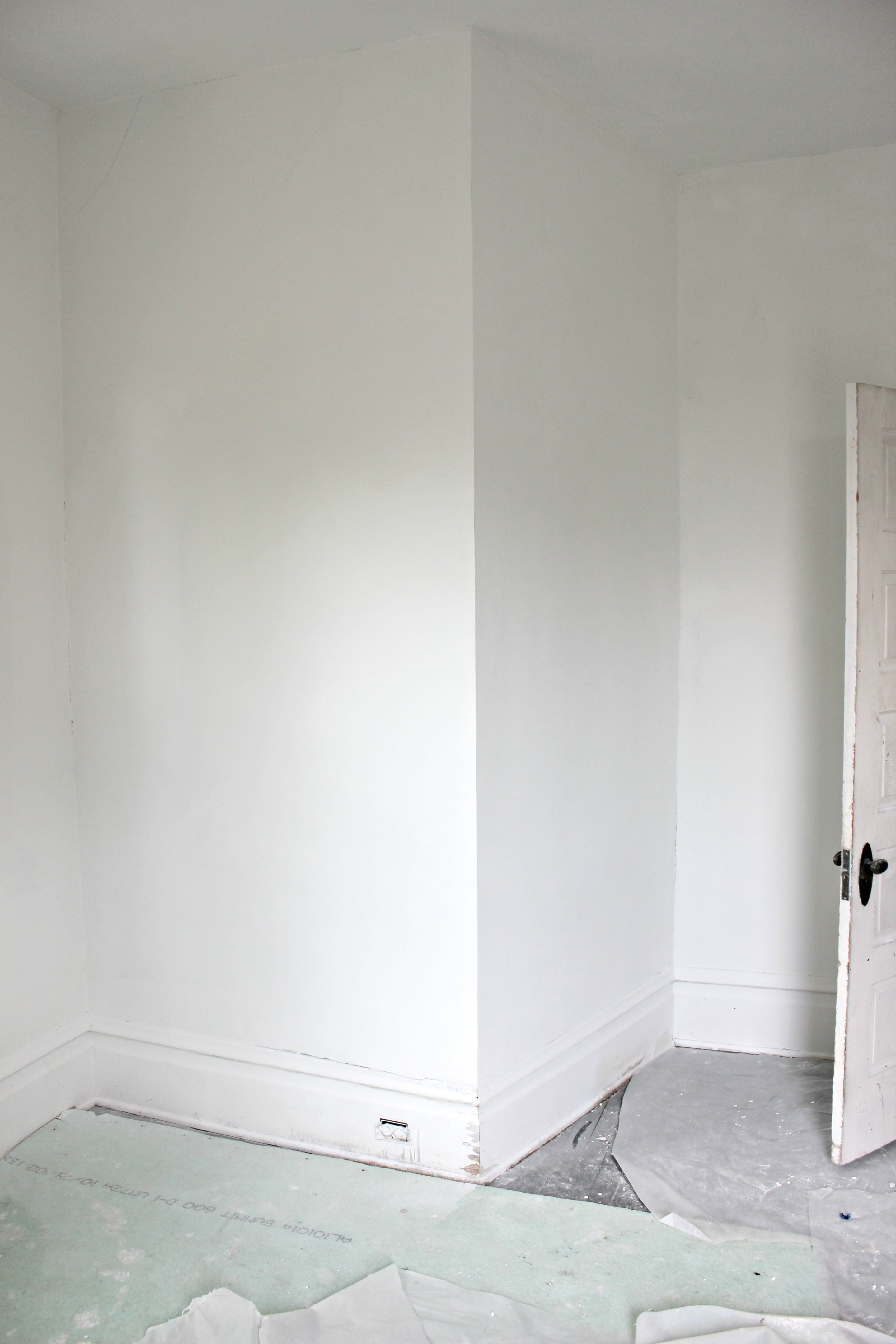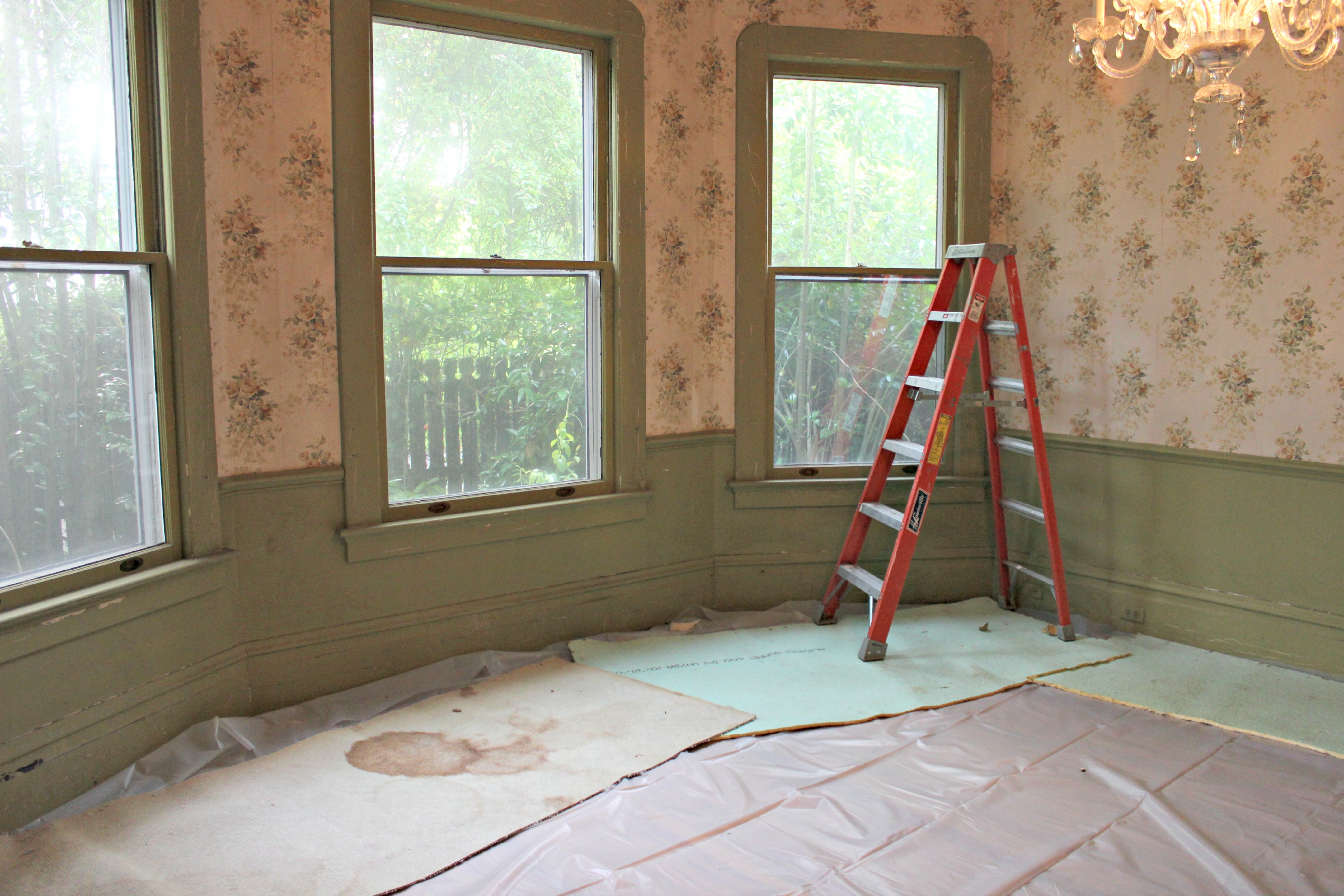 We painted the walls in Kitten White and the trim in a high gloss white. We had minor termite damage (no active termites – yay!!) in the floor, so we went ahead and filled that in to prevent further cracking. We will eventually get around to oiling and refinishing the floors.