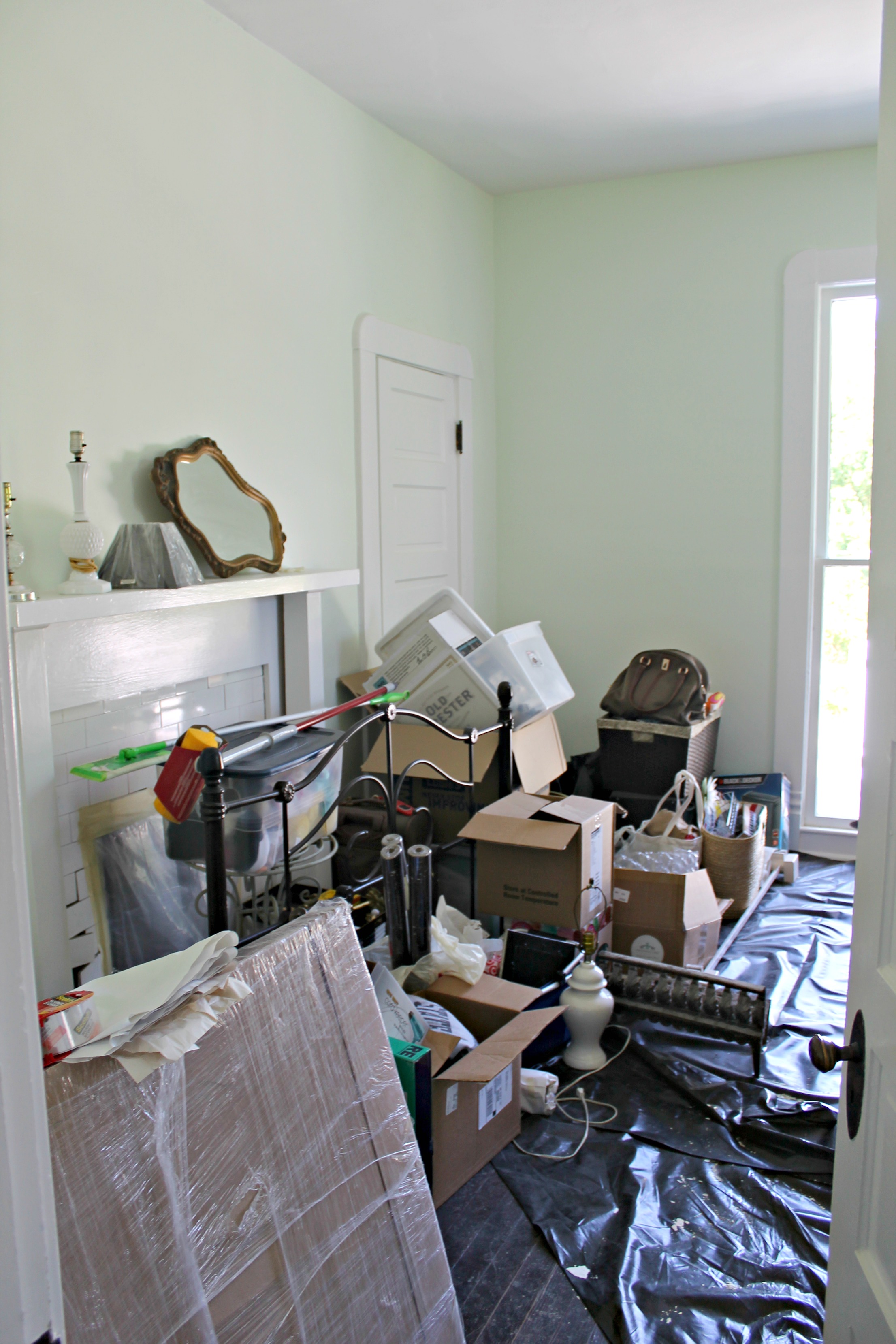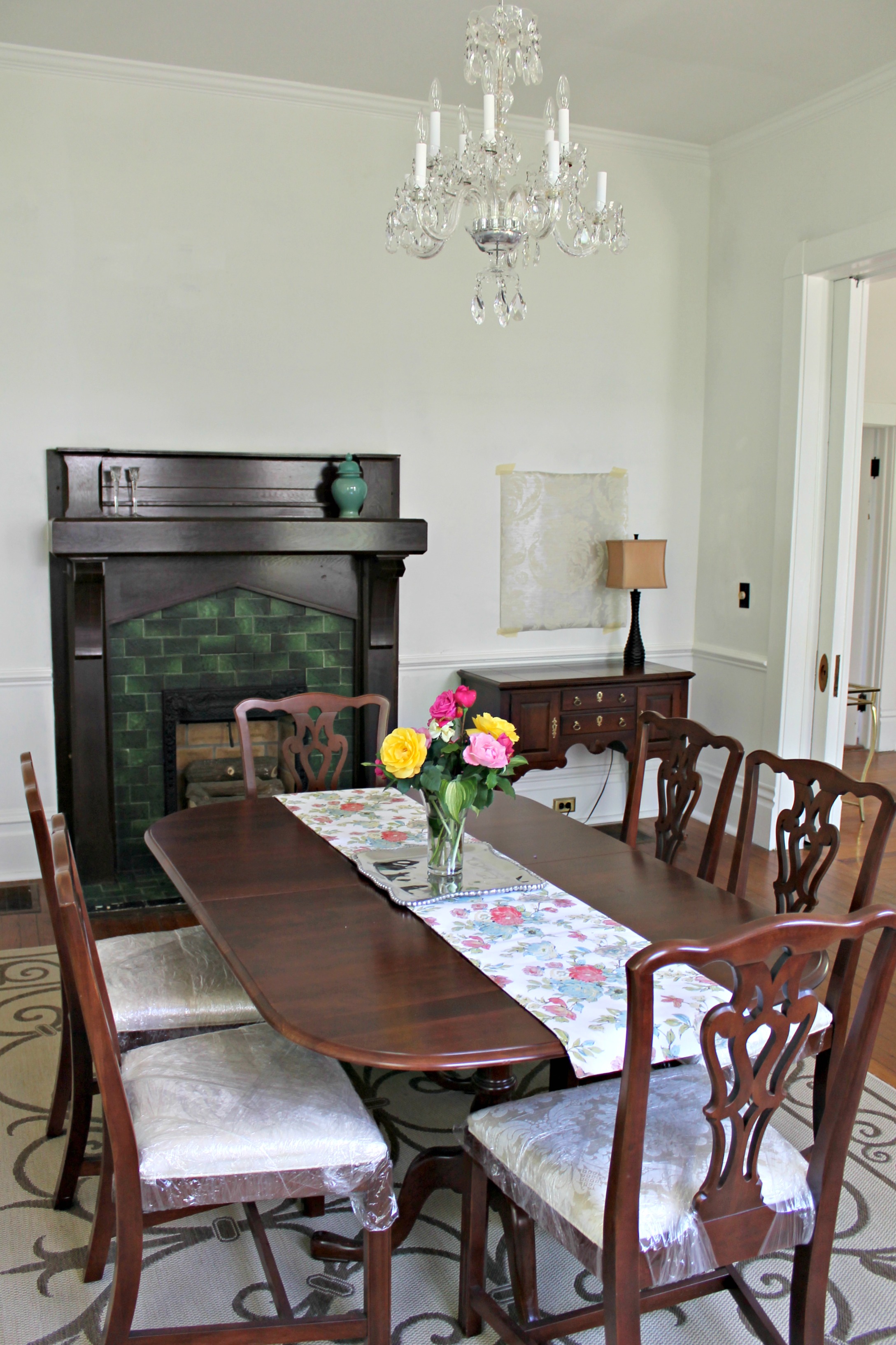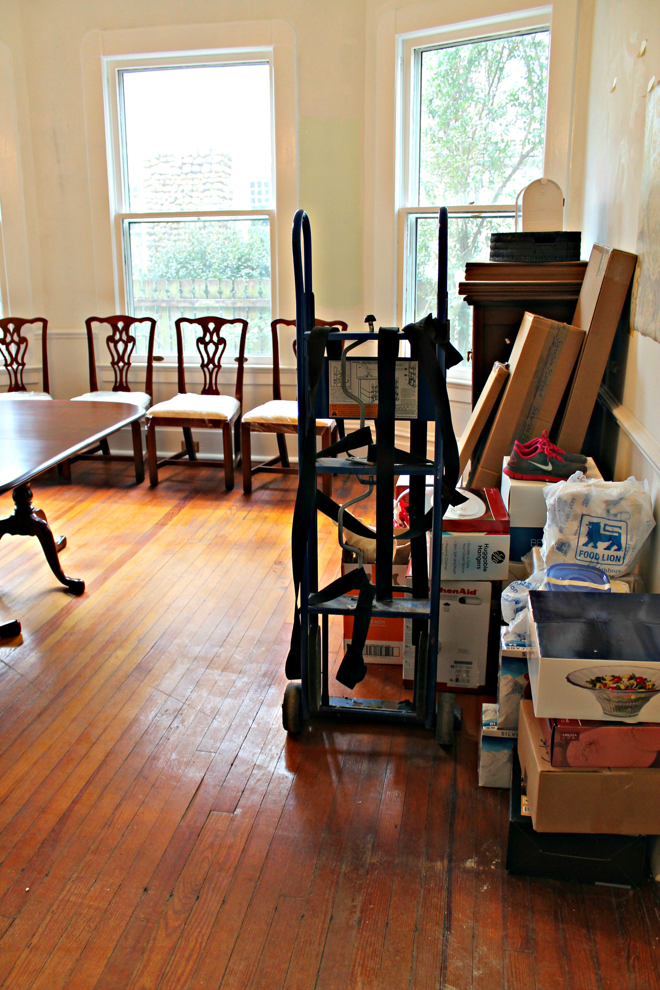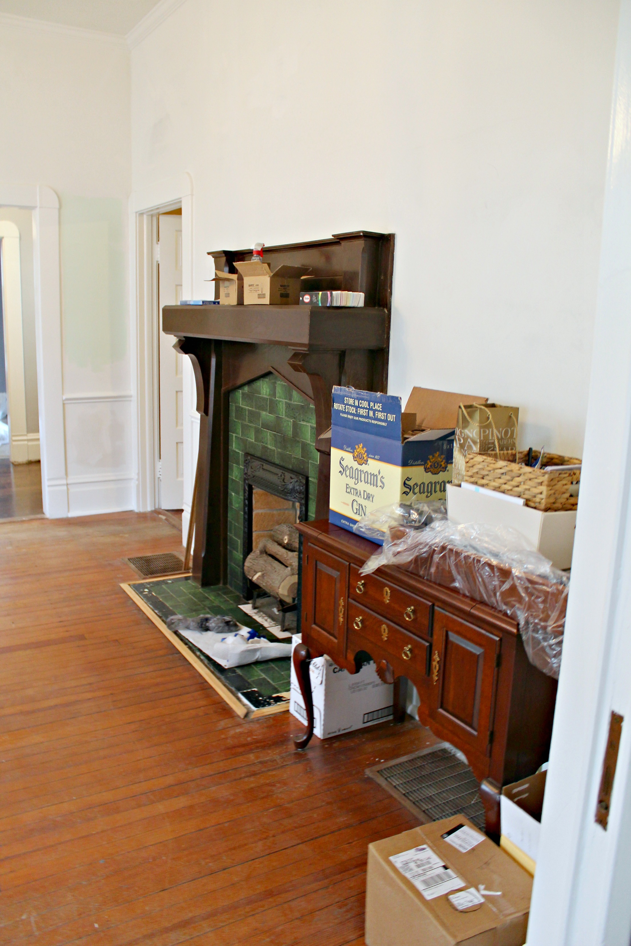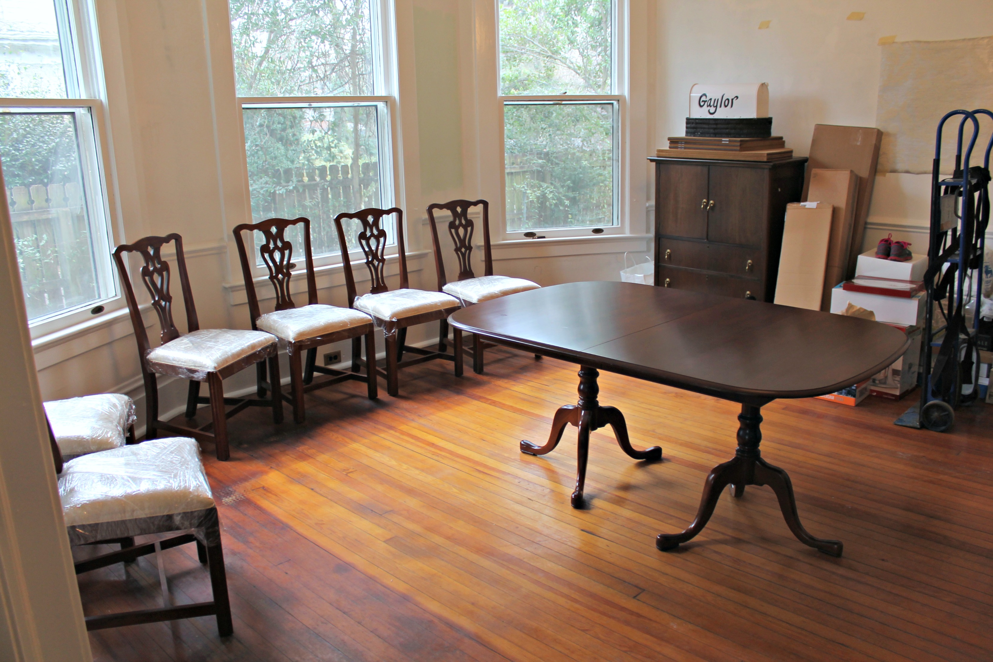 This room is in serious need of some decorating. Right now, it’s kind of serving as a catch-all for furniture and accents that we aren’t sure where to put yet. You may have noticed the blue painter’s tape in the corner around the brass etagere…we are planning to move the piano into that space and the etagere into the formal living room. The black dresser is just waiting to be moved upstairs, and we are in serious need of a rug. But those things will have to wait for now.