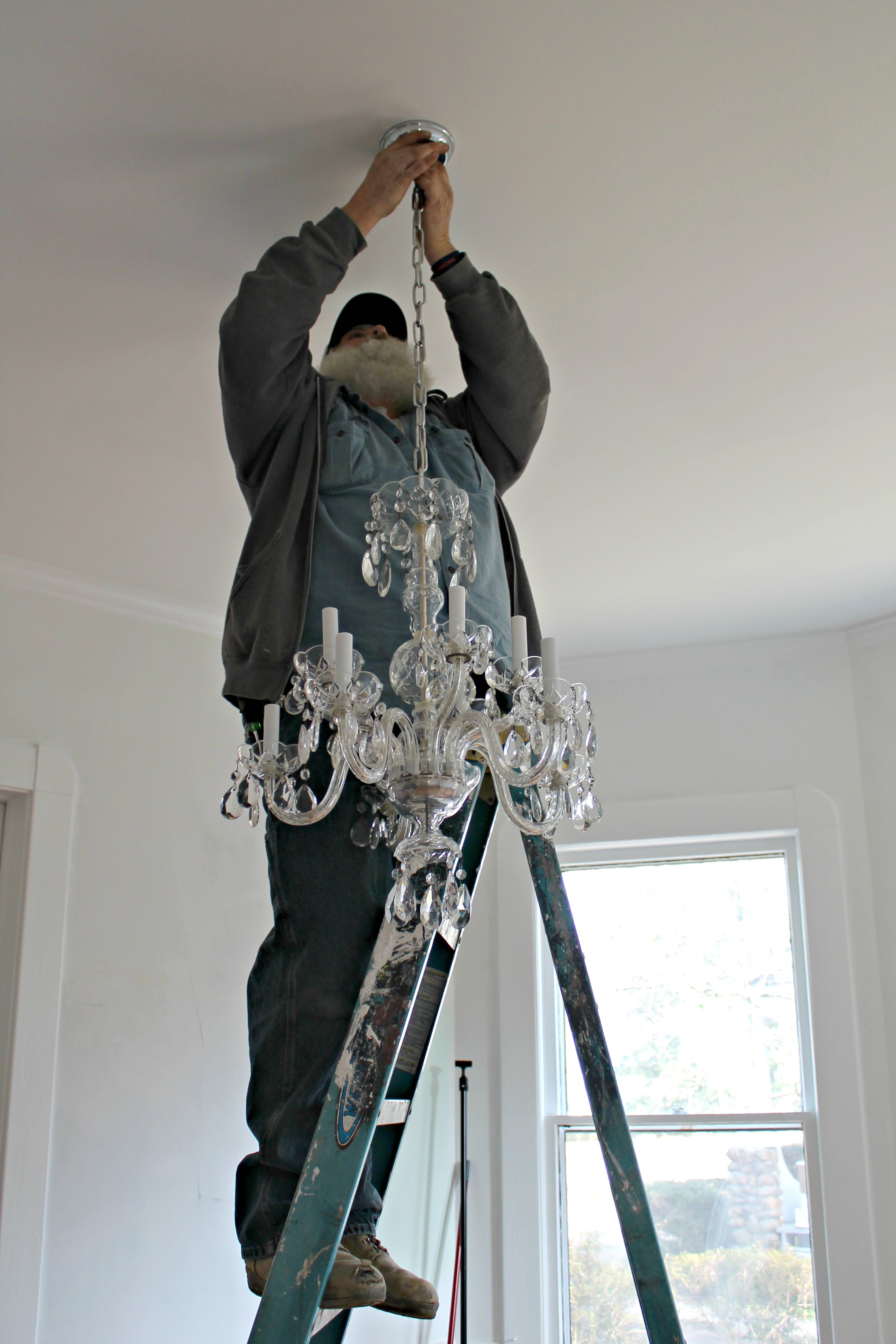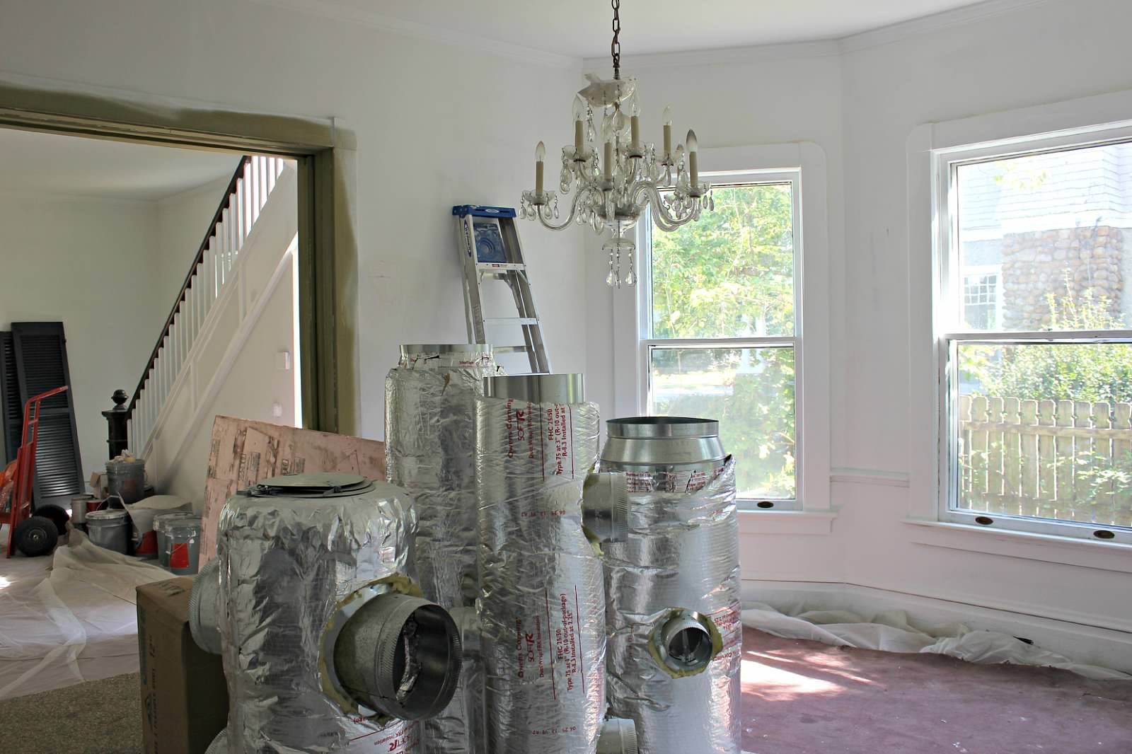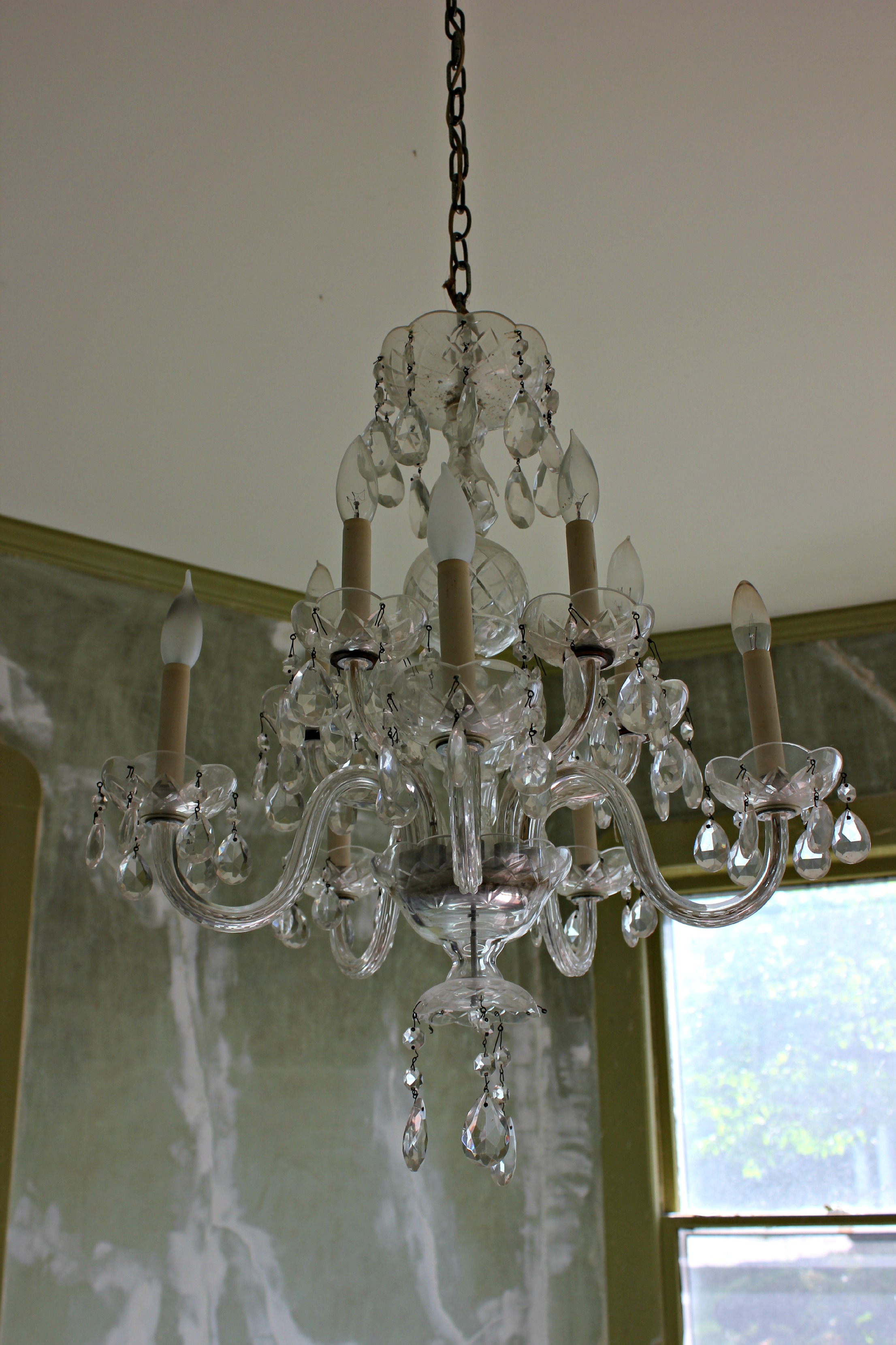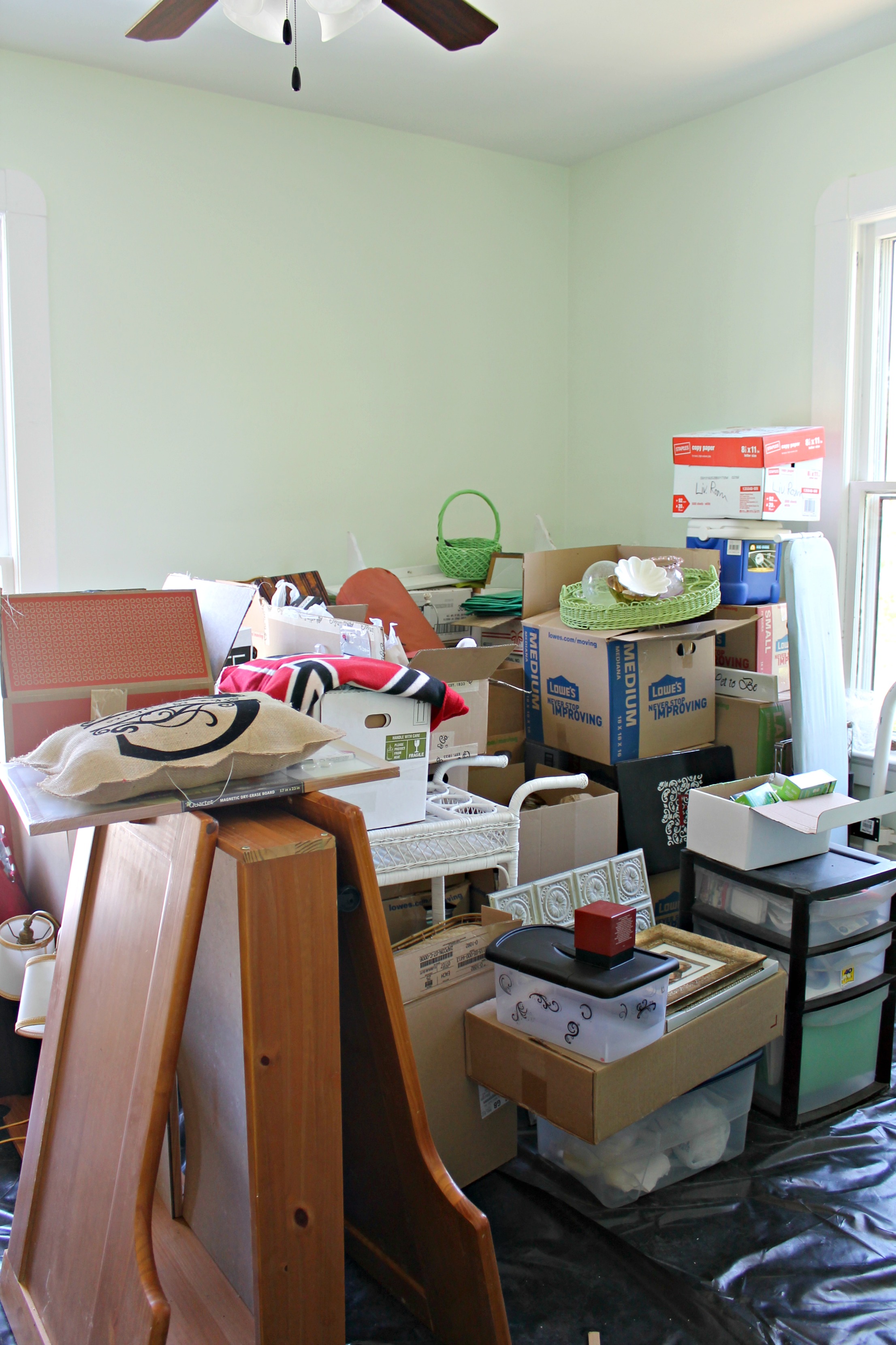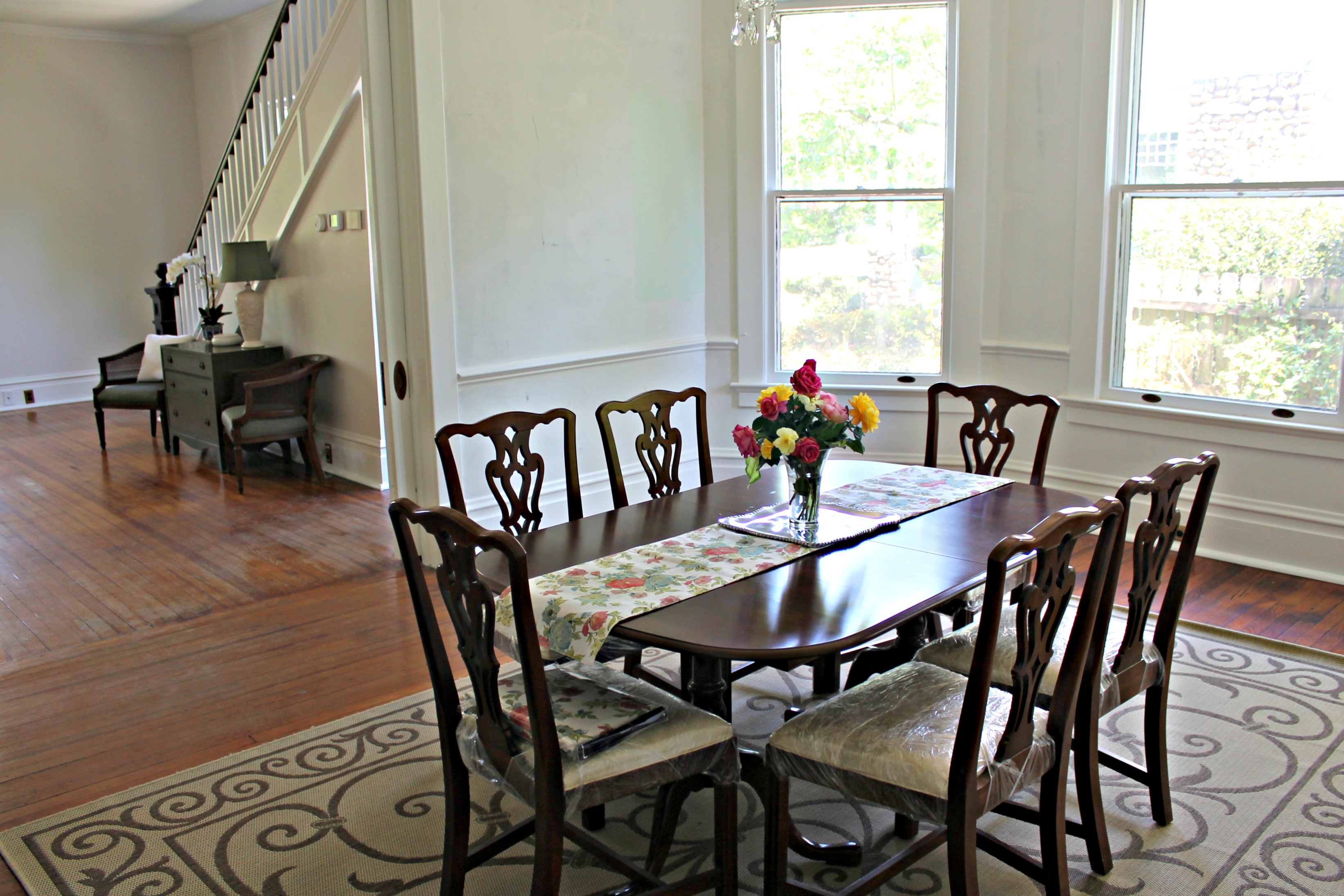 This room is in serious need of some decorating. Right now, it’s kind of serving as a catch-all for furniture and accents that we aren’t sure where to put yet. You may have noticed the blue painter’s tape in the corner around the brass etagere…we are planning to move the piano into that space and the etagere into the formal living room. The black dresser is just waiting to be moved upstairs, and we are in serious need of a rug. But those things will have to wait for now.